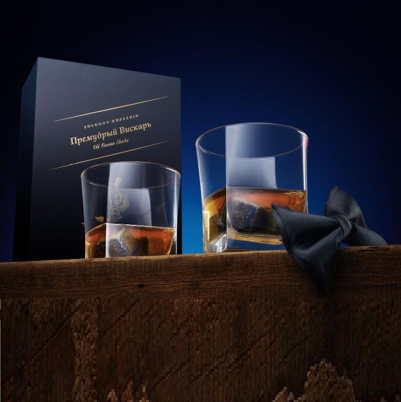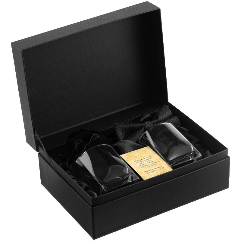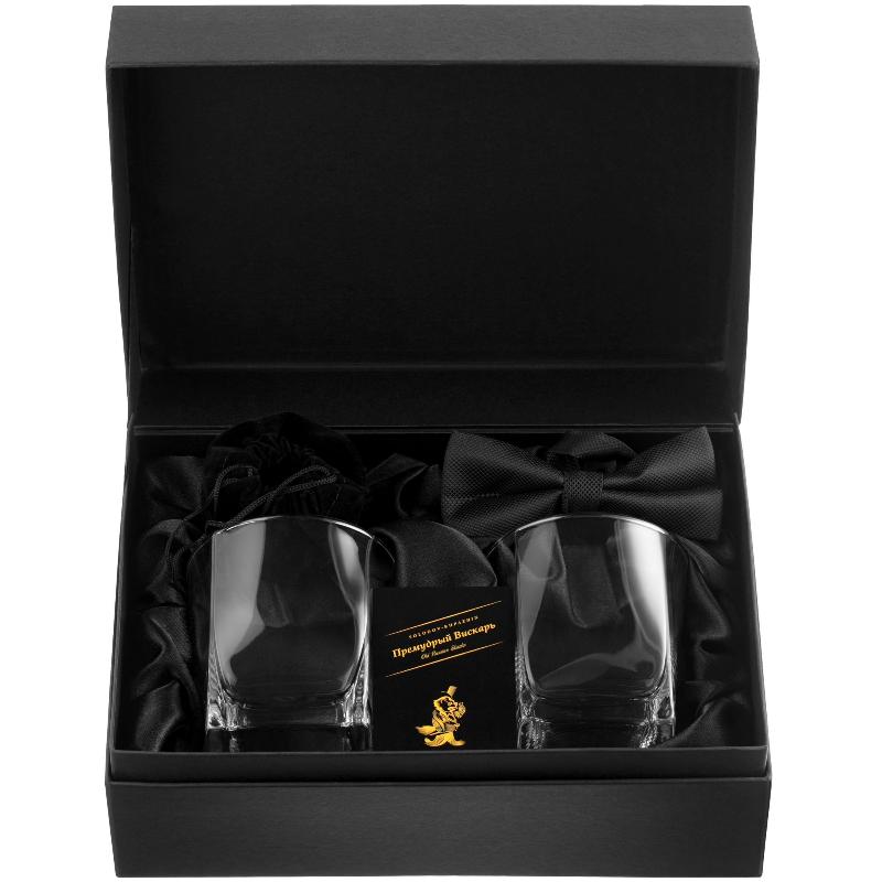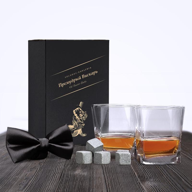 | В наборе | два стакана для виски, камни для виски, жаккардовый галстук-бабочка, черный; открытка «Премудрый вискарь» |