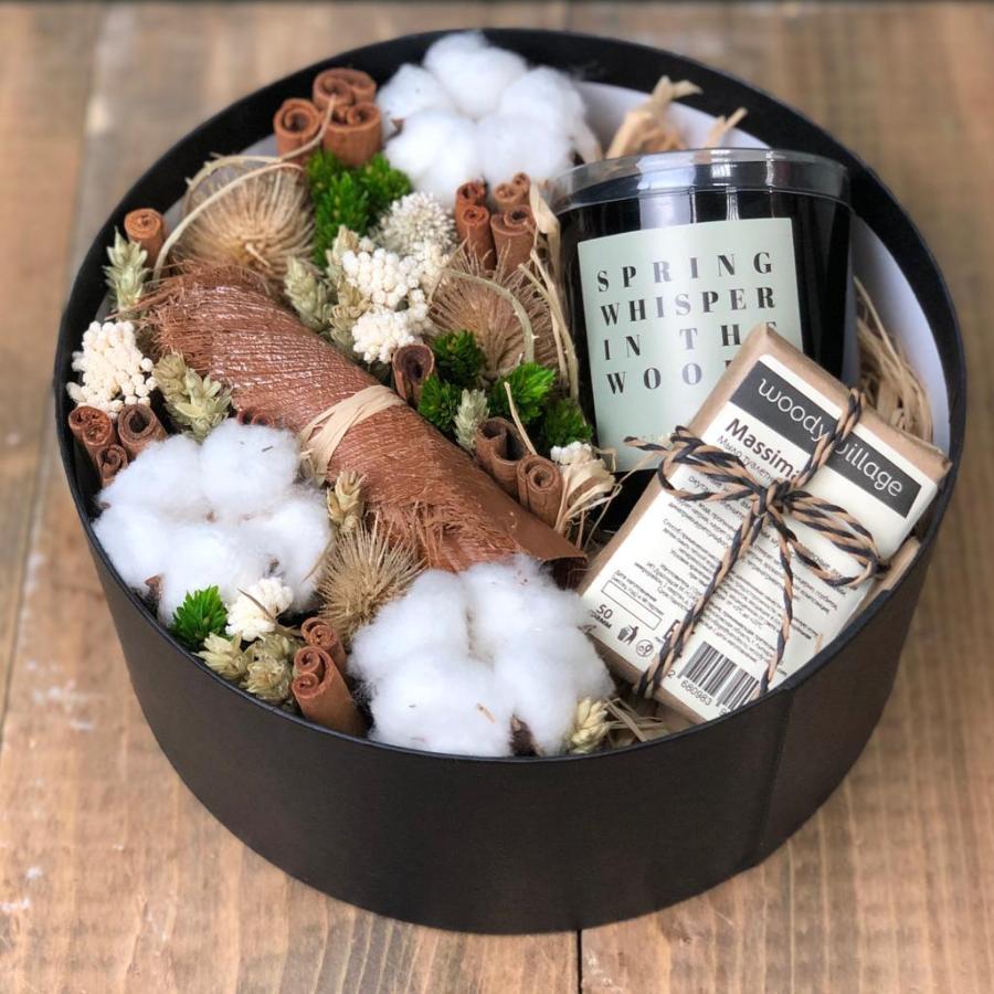 | В наборе | интерьерная свеча; мыло ручной работы; композиция из сухоцветов;открытка. |