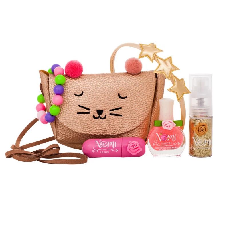 | В комплекте | Изящная золотая сумочка из экокожи в виде кошечки с пушистыми ушками, Золотой ободок, Браслет, Лак для ногтей 7 мл, Бальзам для губ 4 г, Пудра-спрей с блестками 10 г |