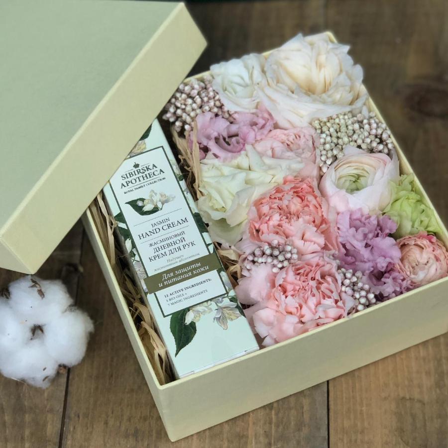 | В наборе | дневной крем для рук; цветы (озатамус, эустома, роза Охара, ранункулюс). |