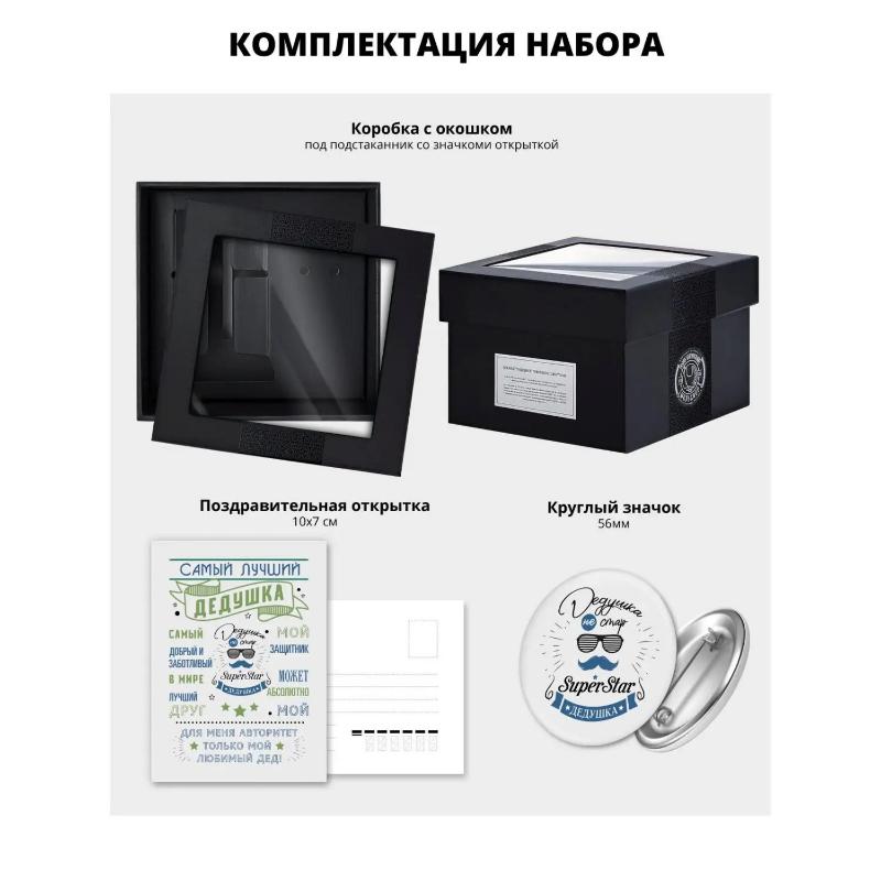 Комплектация Подстаканник + Стакан + Открытка + Значок + Подарочная упаковка