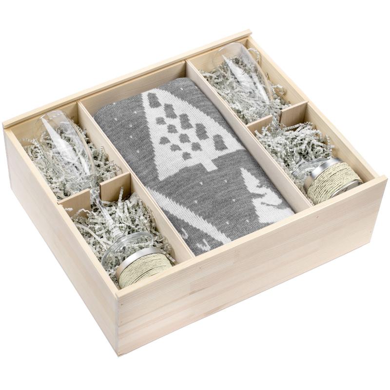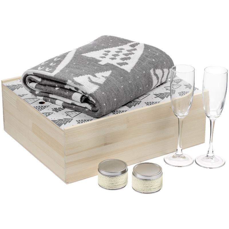 | В набор входят | 2 бокала для шампанского (емкость по 175 мл), 2 ароматические свечи (с ароматом ванили или кофе), двусторонний полушерстяной плед, упаковка - деревянная коробка с крышкой |