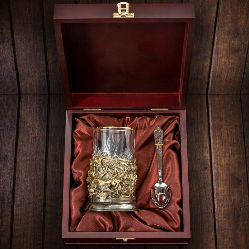 | Детали | В набор входит подстаканник, стакан, чайная ложка, деревянная шкатулка с шелковым коричневым ложементом внутри |