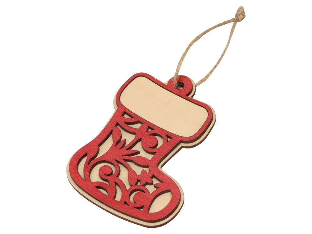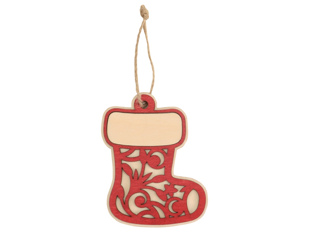 Оригинальное елочное украшение в виде новогоднего валенка, в который принято прятать подарки. Подвеска выполнена из березовой фанеры и тонирована в красный цвет. Ажурный красный слой подчеркивает натуральную текстуру и придает игрушке объемность. Поле для нанесения – верхняя часть валенка, отворот, на котором будут уместно выглядеть лого или надпись.