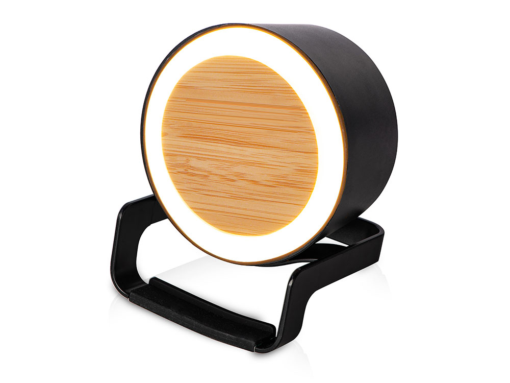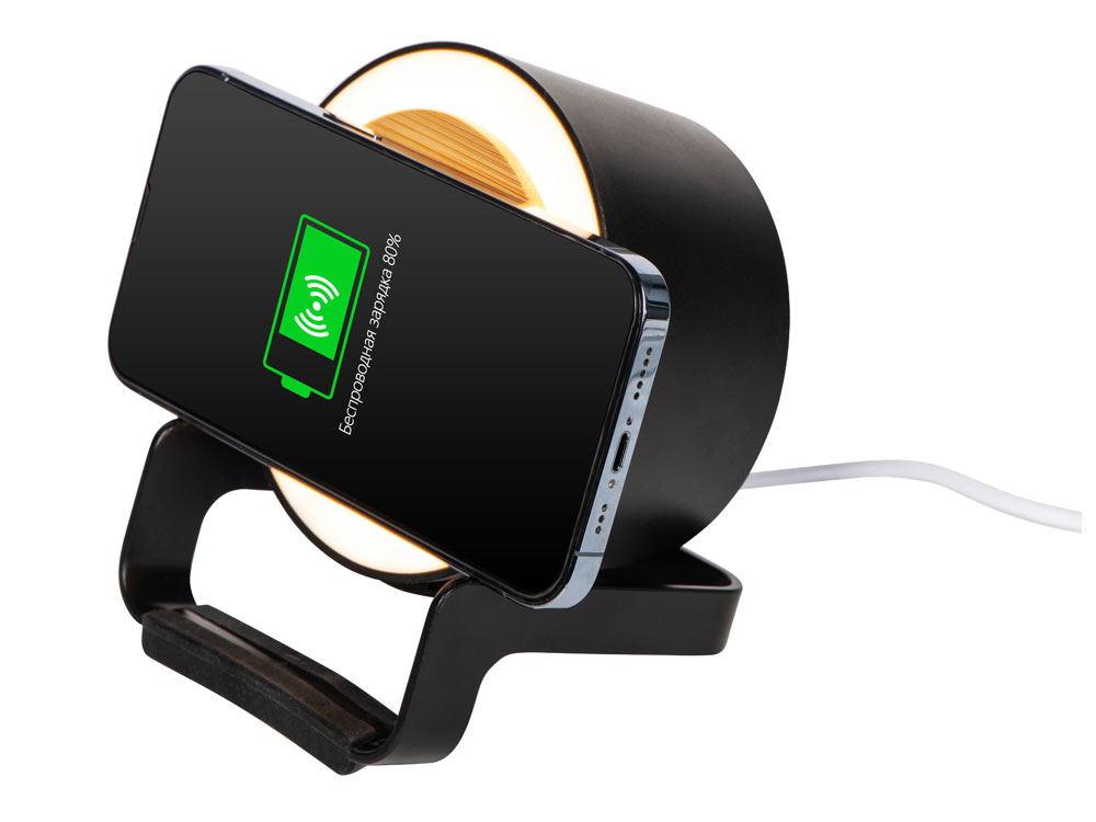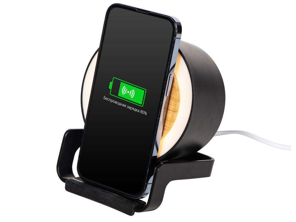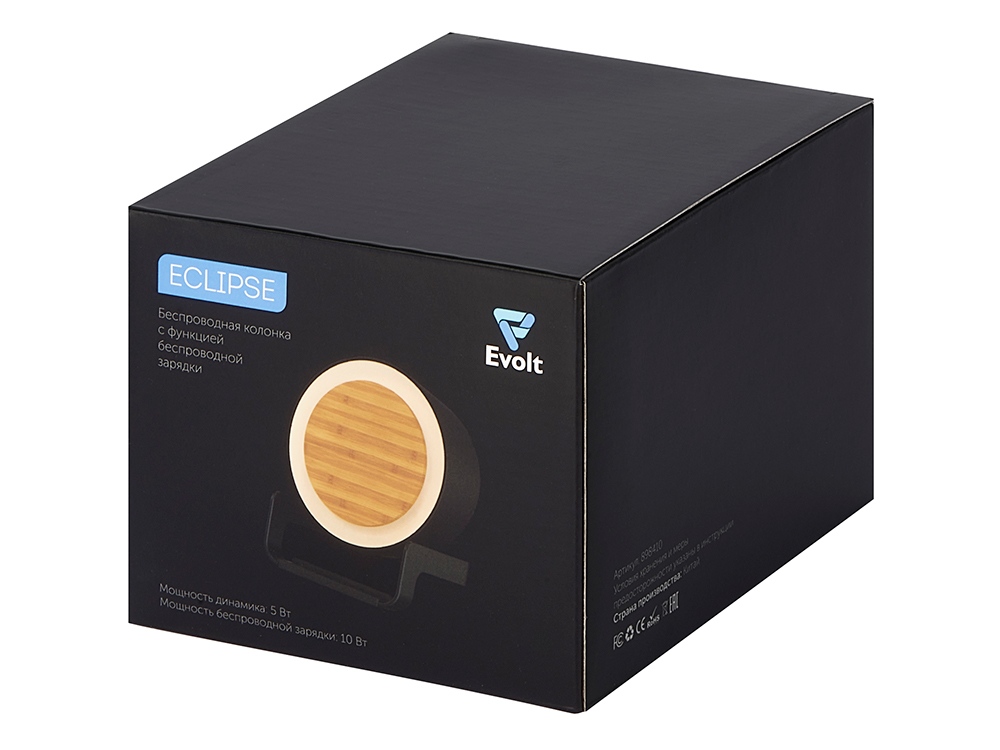 Беспроводная колонка Eclipse не только воспроизводит музыку, но и заряжает Qi-совместимые устройства, которые можно комфортно разместить на специальной подставке. Идеальный вариант для экономии места на рабочем месте или прикроватной тумбочке, кроме того, колонка подсвечивается, что помогает создать нужную вам атмосферу. - подходит для персонализации разными методами нанесения - 4 режима подсветки - лаконичный силуэт колонки позволяет вписать ее в любой интерьер и сочетать с любыми логотипами - беспроводная зарядка до 10 Вт Qi-совместимых устройств с горизонтальным и вертикальным размещением - мощный динамик 5 Вт - фронтальная панель из натурального бамбука