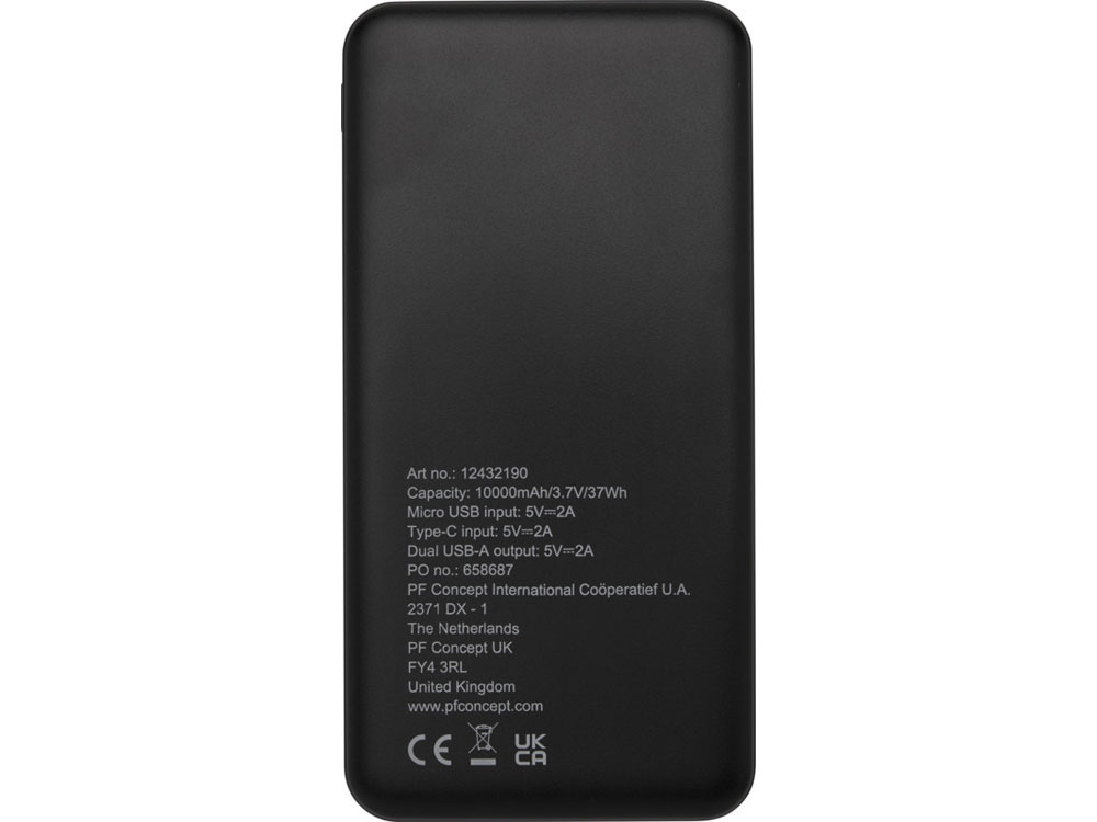 Портативное зарядное устройство изготовлено из переработанного пластика ABS. Портативное зарядное устройство работает от литий-полимерного аккумулятора класса А емкостью 10 000 мАч с длительным сроком службы для быстрой зарядки. Индикаторы питания показывают уровень оставшейся энергии, поэтому вы всегда будете знать, когда устройство необходимо зарядить. Вход Тип-C 5 В/2 А, вход Micro USB 5 В/2 A, двойной выход USB-A 5 В/2 А, общая мощность 10 Вт. Поставляется с зарядным кабелем USB-A - Type-C 2 А из термополиэтилена длиной 30 см, инструкцией по эксплуатации и подарочной коробкой из крафт-бумаги.