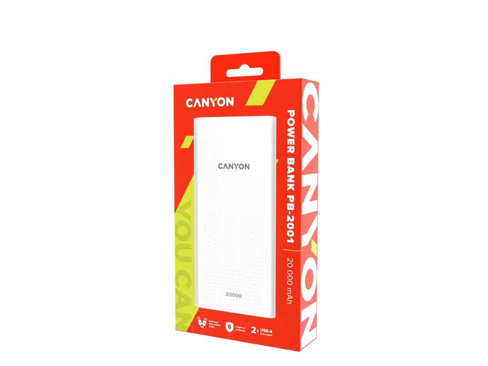 Каждый пользователь гаджетов сталкивался с проблемой — смартфон или наушники разряжаются на самом интересном месте сериала, игры или горячего диалога в чате! Чтобы вы могли пользоваться мобильным устройством в течении всего дня, не опасаясь о разряженной батарее, Canyon выпустил модель аккумулятора PB-2001. Ее отличает максимальная емкость при довольно компактном размере, а также 2 зарядных входа — Micro-USB и Type-C. Аккумулятор заряжает 2 устройства одновременно через выход USB-A. Кроме того, повербанк снабжен шестью типами защиты и облачен в стильный темно-графитовый или белый корпус. Максимум производительности и минимум места в вашей сумке!