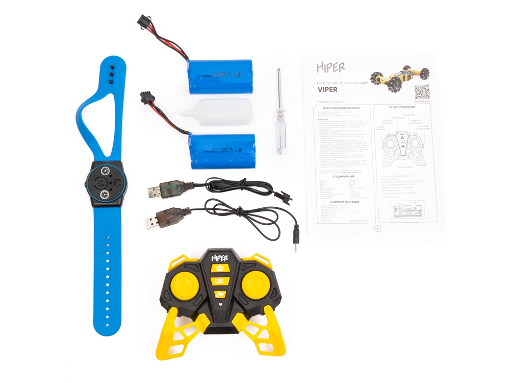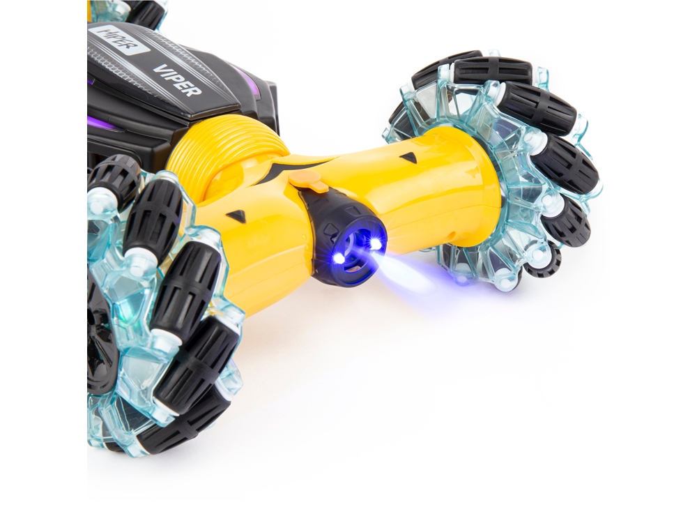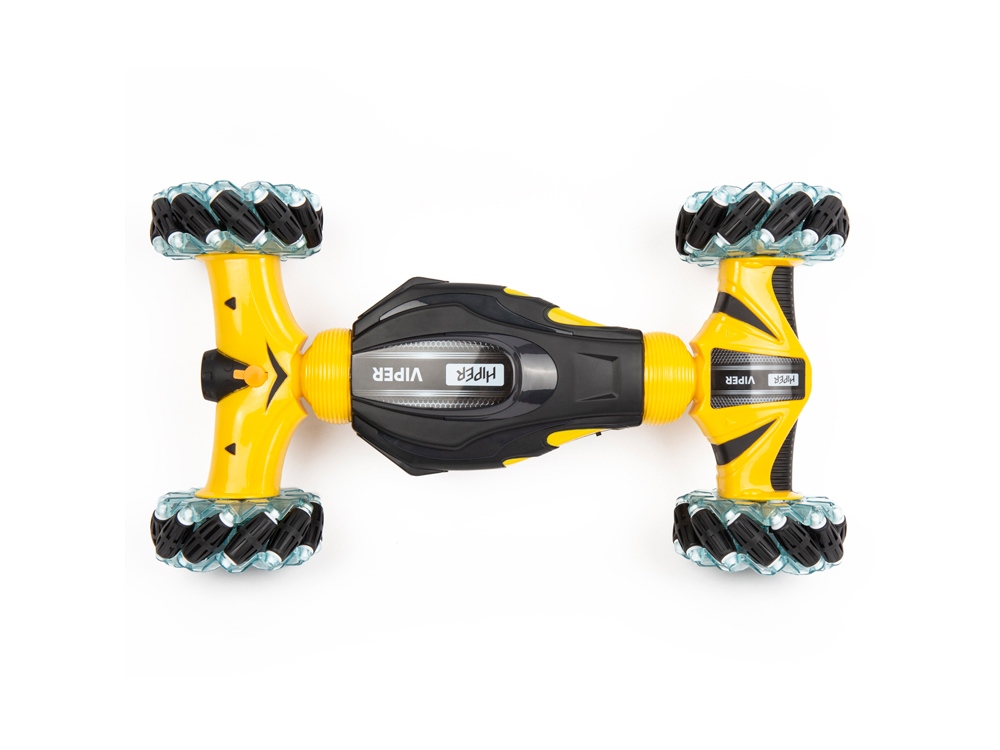 HIPER VIPER 4х4 полноприводная радиоуправляемая машинка перевёртыш, оснащенная всенаправленными-роликовыми колёсами, системой генерации пара и светодиодной подсветкой кузова, колёс и парогенератора. Машинка перевёртыш обладает внушительными размерами - целых 40 сантиметров крутости, безудержной силы и небывалой проходимости. Для генерации пара имеется специальный резервуар, в который необходимо залить обыкновенную воду, а чтобы появилась струя пара, нужно нажать на специальную кнопку и HIPER VIPER 4х4 начнёт генерировать пар, который станет переливаться различными оттенками, из-за встроенных светодиодов. Управлять внедорожником можно не только с пульта управления, но и посредством жестов, при помощи браслета. Увлекательный процесс управления понравится не только детям, но и взрослым. И все это будет сопровождаться звуковыми эффектами работающего мотора, музыкой и яркой подсветкой, особенно эффектно заезды смотрятся в темноте. ВПЕЧАТЛЯЮЩИЕ ХАРАКТЕРИСТИКИ Благодаря всенаправленным-роликовым колёсам Mecanum HIPER VIPER 4х4 может ехать боком и по диагонали, а также вращаться на 360 градусов, но и способен взбираться на небольшие преграды и преодолевать кочки и ухабы. Помимо роликовых колёс автомодель обладает ёмким аккумулятором, который обеспечивает до 25 минут работы на одном заряде. УПРАВЛЕНИЕ ЖЕСТАМИ С помощью браслета, который фиксируется на ладони можно управлять внедорожником жестами одной руки, а также вкл/выкл парогенератор нажав на кнопку. При этом можно управлять не только направлением движения, но и изменять высоту подвески машины. Особенности: - Генератор пара - Всенаправленные-роликовые колёса Mecanum - Управление жестами при помощи браслета - Два пульта управления - Звуковые и световые эффекты - Вращения на 360 градусов - Машинка трансформер - Функция демо режима - Время игры до 25 мин - Масштаб 1:12 - Максимальная скорость до 15 км/ч - Прочные детали из АБС пластика / В комплекте 2 АКБ Технические характеристики: - Радиус действия: до 40 метров - Длина машины - 40 см - Ширина машины - 22 см - Высота машины - 9,4 см - Аккумулятор: Li-Ion 7.4В / 1200 мАч - Вес автомодели: 935 г - Время игры: ~ 25 мин - Время зарядки аккумулятора: до 180 мин - Время зарядки ручного пульта управления: до 60 мин Рекомендуется докупить: • 2 батарейки AА