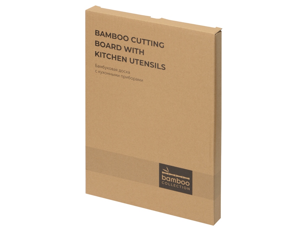 Бамбуковая доска с кухонными принадлежностями - отличный подарок для любителя готовки и кулинарии. В комплекте скошенная лопатка и ложка с функцией вилки. На доске имеется прорезь для подвешивания доски.
