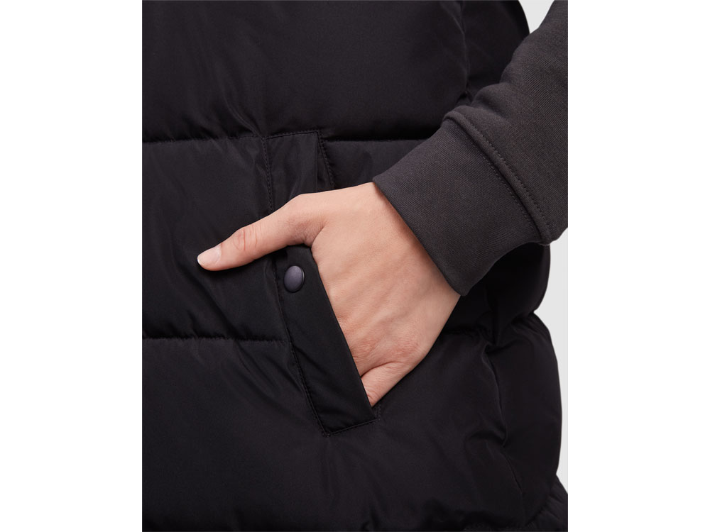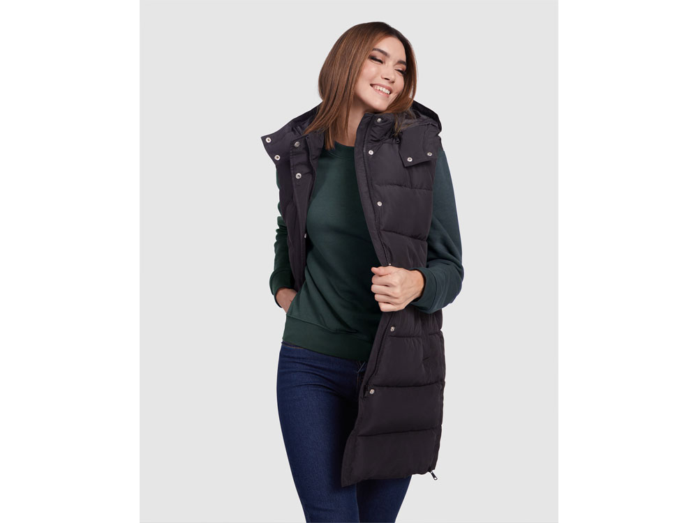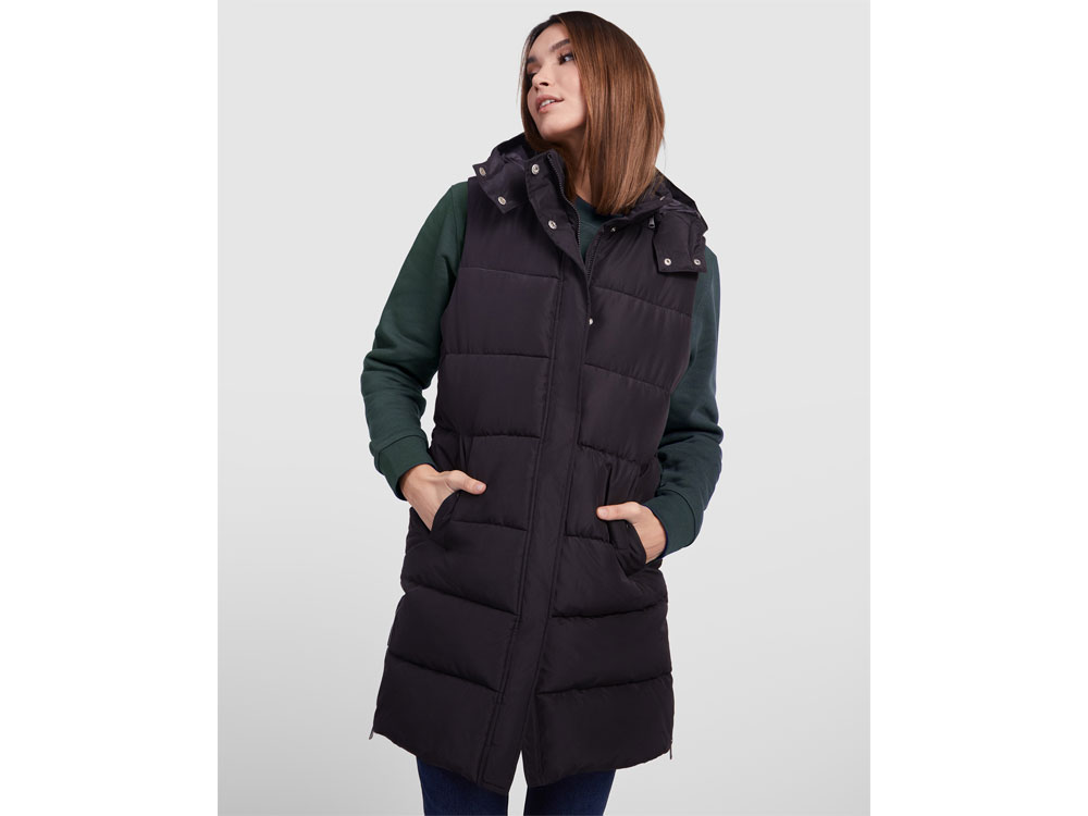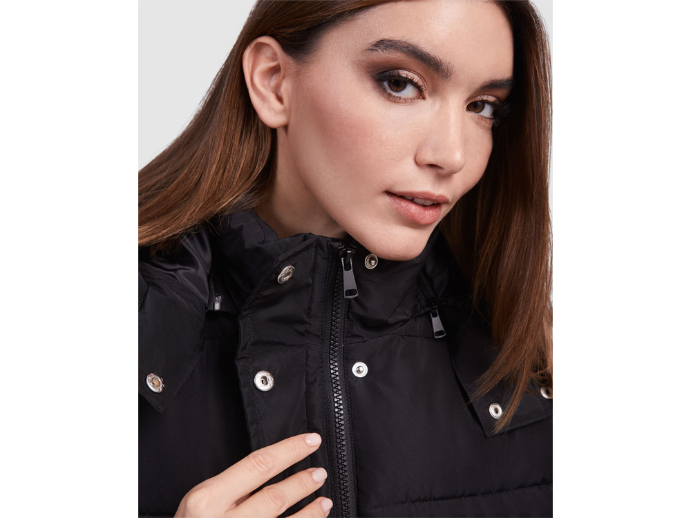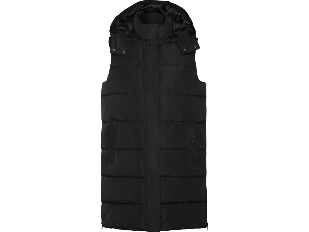 Женский стеганый жилет со съемным капюшоном. · Высокий воротник. · Передняя застежка на молнию и кнопки. · Два кармана на кнопках. · Боковые разрезы продублированы молниями. · Внутренний доступ для нанесения