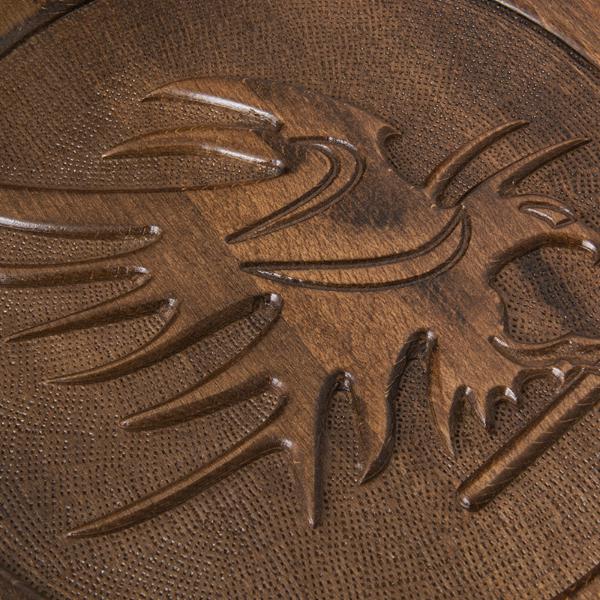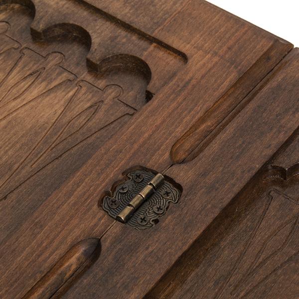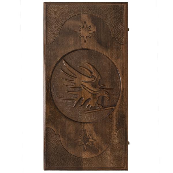 Резные нарды Орел в один миг переносят нас в далекие горы, где парят свободолюбивые птицы и над облаками сияют звезды. Именно эти мотивы и запечатлены на этом комплекте. Кроме поля для игры в нарды, вы найдете здесь поле для шашек. Корпус вручную вырезан из дерева(орех) и вручную же декорирован, что добавляет значительности такому символическому подарку, ведь второго такого же нет и не будет в целом свете.