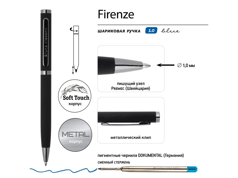 Шариковая металлическая ручка из коллекции Firenze от Bruno Visconti - бизнес-аксессуар, с которым вы всегда будете чувствовать себя уверенно и комфортно. Лаконичный дизайн, прочный металлический корпус, строгость формы подчеркнут статус владельца ручки. Удобство в эксплуатации и тактильно приятные ощущения подарит бархатистое покрытие Soft Touch. Ручка автоматическая, с легким поворотным механизмом подачи стержня. Надежный пишущий узел d 1,0 мм (от швейцарского производителя Premec) гарантирует высокое качество также, как и пигментные чернила Dokumental (Германия). Благодаря им писать ручкой Firenze одно удовольствие – она мягко скользит по поверхности бумаги, оставляя ровную, четкую линию.