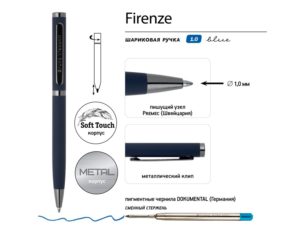 Шариковая металлическая ручка из коллекции Firenze от Bruno Visconti - бизнес-аксессуар, с которым вы всегда будете чувствовать себя уверенно и комфортно. Лаконичный дизайн, прочный металлический корпус, строгость формы подчеркнут статус владельца ручки. Удобство в эксплуатации и тактильно приятные ощущения подарит бархатистое покрытие Soft Touch. Ручка автоматическая, с легким поворотным механизмом подачи стержня. Надежный пишущий узел d 1,0 мм (от швейцарского производителя Premec) гарантирует высокое качество также, как и пигментные чернила Dokumental (Германия). Благодаря им писать ручкой Firenze одно удовольствие – она мягко скользит по поверхности бумаги, оставляя ровную, четкую линию.