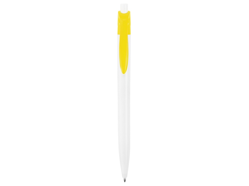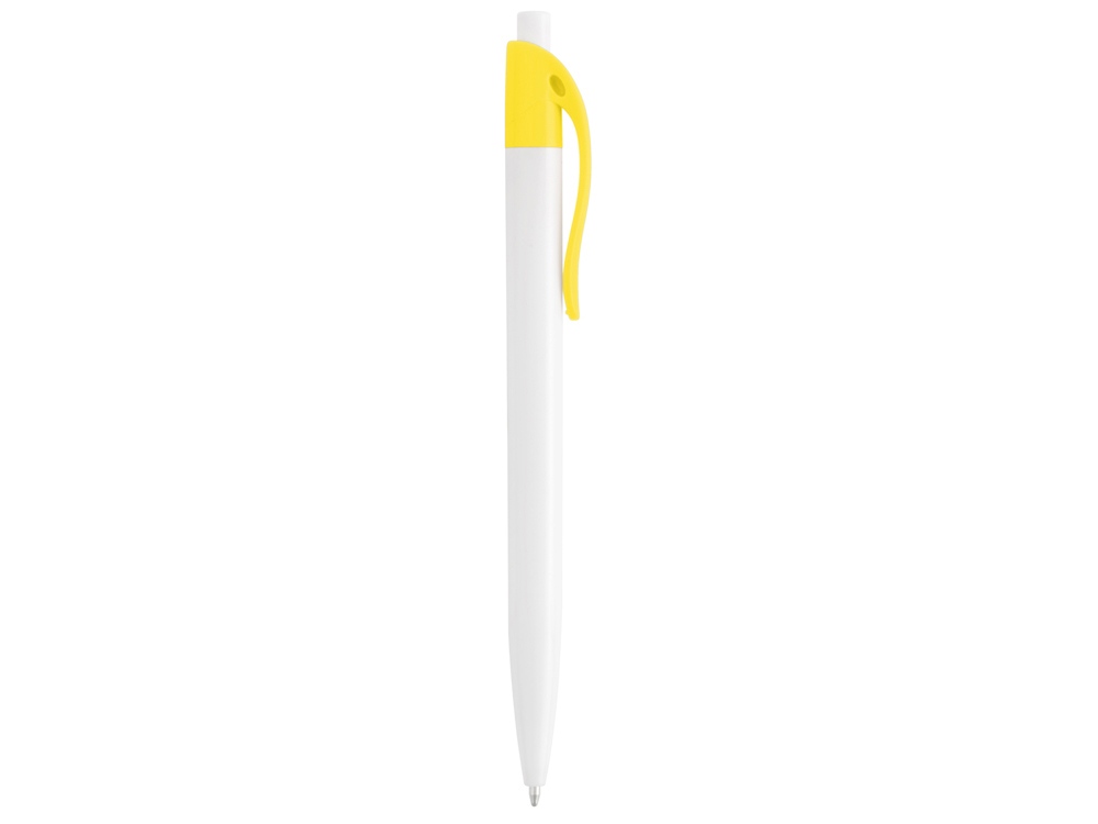 Стильная пластиковая ручка с ярким цветным клипом и белым корпусом отлично подойдет для нанесения логотипов и рекламной информации. Нажимной механизм.