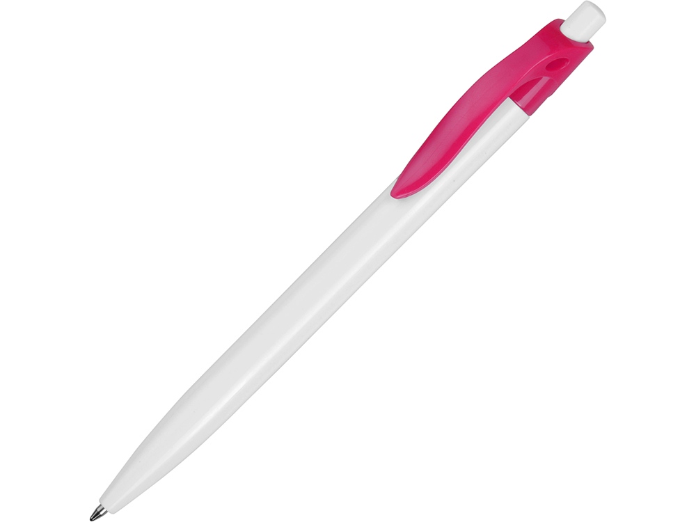 Стильная пластиковая ручка с ярким цветным клипом и белым корпусом отлично подойдет для нанесения логотипов и рекламной информации. Нажимной механизм.