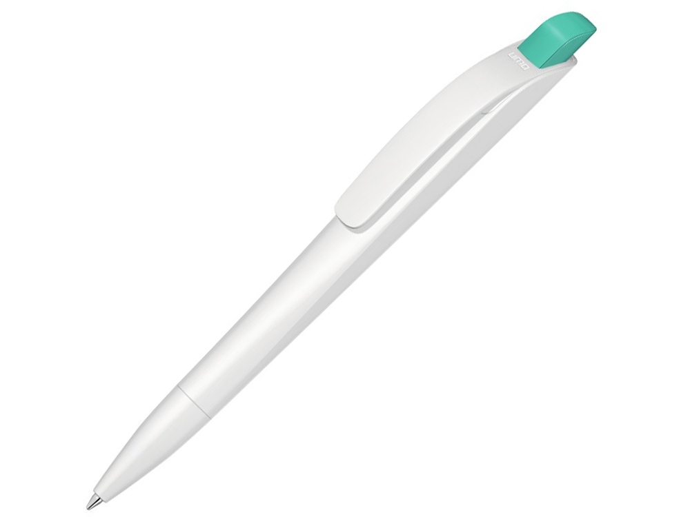 Автоматическая шариковая ручка с нажимным механизмом, матовым тонированным белым корпусом и цветным наконечником, широким изогнутым клипом.