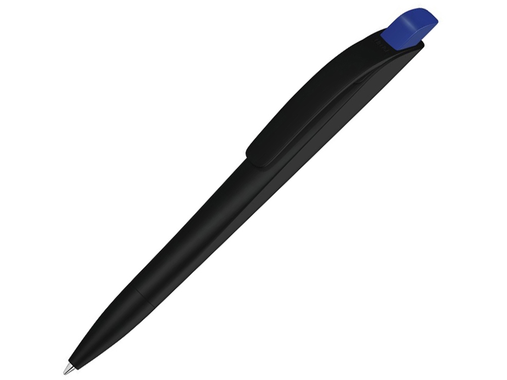 Автоматическая шариковая ручка с нажимным механизмом, матовым тонированным черным корпусом и цветным наконечником, широким изогнутым клипом.