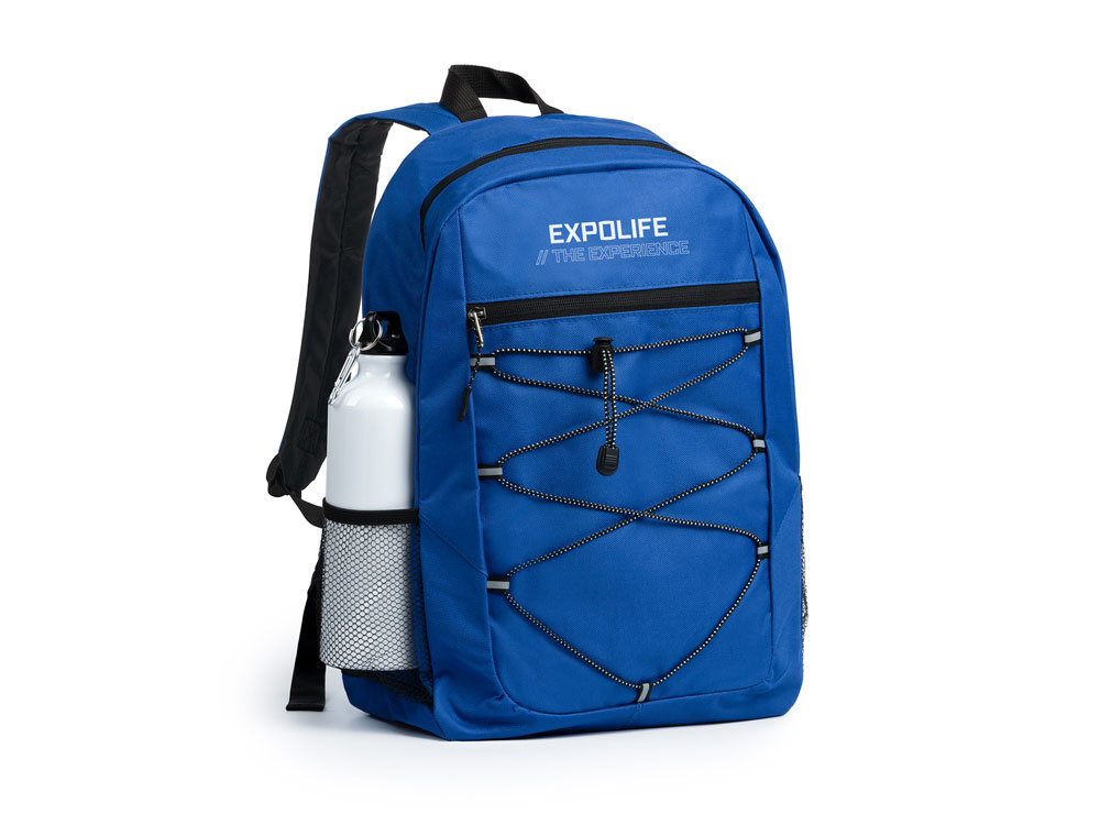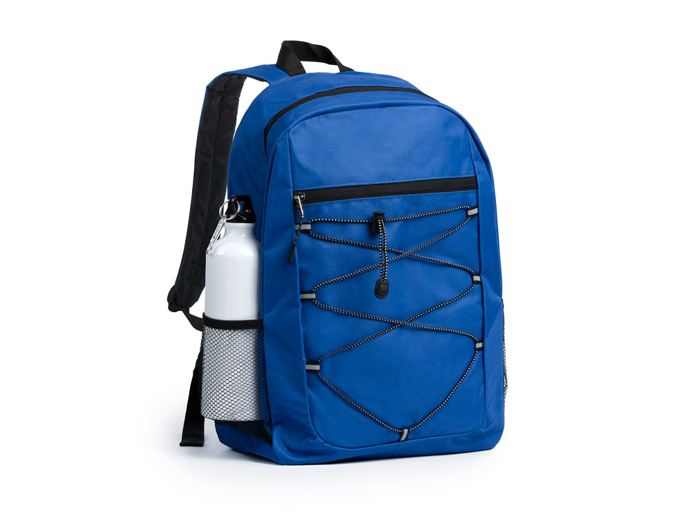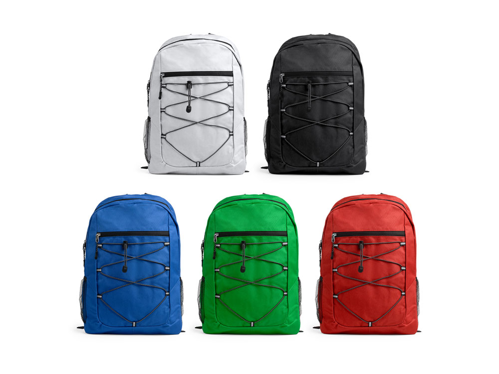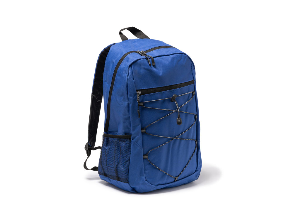 Спортивный рюкзак из полиэстера 600D. Основное отделение и передний карман на молнии. Переднее отделение на эластичном шнуре с сетчатыми боковыми карманами. Мягкая спинка и лямки.