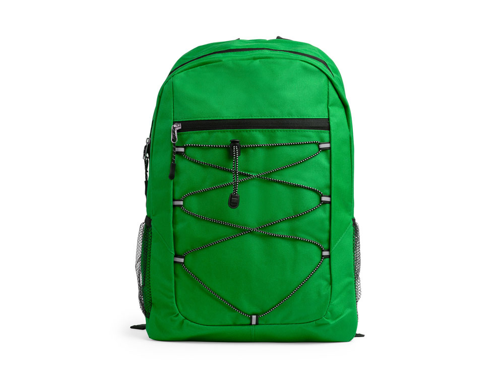 Спортивный рюкзак из полиэстера 600D. Основное отделение и передний карман на молнии. Переднее отделение на эластичном шнуре с сетчатыми боковыми карманами. Мягкая спинка и лямки.