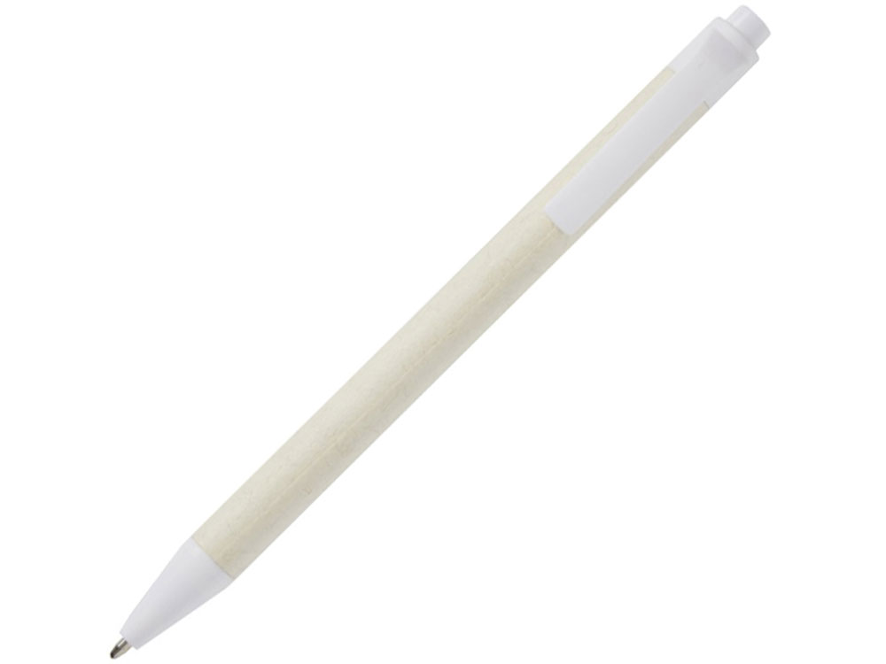 Шариковая ручка с кнопочным механизмом и корпусом из переработанных коробок из-под молока (до 70%). Кнопка, зажим и наконечник изготовлены из PLA-пластика. Картонные коробки из-под молока собираются, сортируются, перерабатываются и превращаются в бумагу, таким образом действительно превращая мусор во что-то полезное.