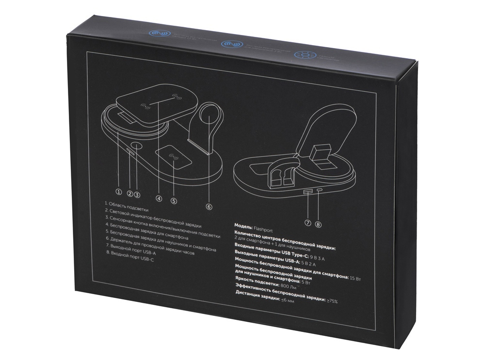 Flashport от Evolt - это складная зарядная станция с беспроводной зарядкой для телефона и наушников. В комплекте также идет подставка под зарядку для наручных смарт-часов. На регулируемой панели зарядки смартфона расположены 2 катушки (2 центра беспроводной зарядки), которые позволяют заряжать ваш девайс как в вертикальном, так и горизонтальном положении. Беспроводная зарядка для наушников мощностью 5 Вт подходит для зарядки не только беспроводных наушников, но и второго смартфона. Чтобы включить встроенную лампу, нажмите сенсорную кнопку 1 раз. Для плавного изменения яркости света нажмите и удерживайте сенсорную кнопку при включенной лампе. Кабель 100 см в комплекте. • Быстрая беспроводная зарядка смартфона 15 Вт • Беспроводная зарядка наушников 5 Вт • Лампа-диммер яркостью до 800 Лм • Дополнительный порт USB-A для зарядки внешних устройств