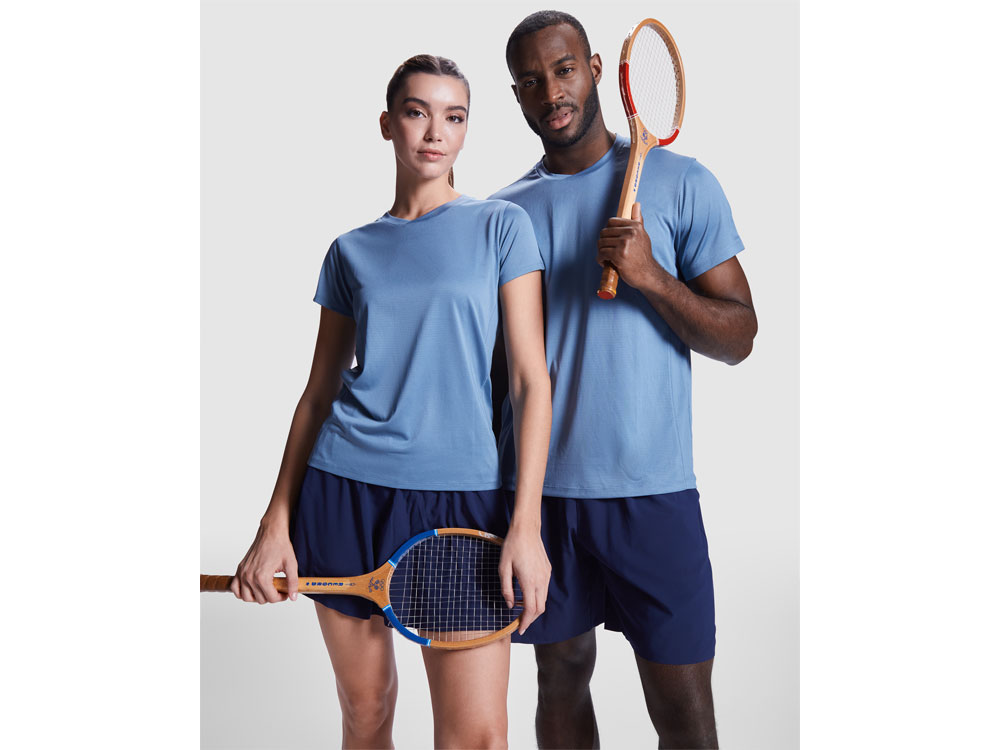 Мужская технологическая футболка с короткими рукавами. Легкая ткань из переработанного полиэстера. · Воротник с перекрещенными деталями. · Кокетка сзади и рукава из дышащей ткани. · Направленные вперед и наклонные швы по бокам и плечам. · Комбинация дышащих и эластичных тканей.