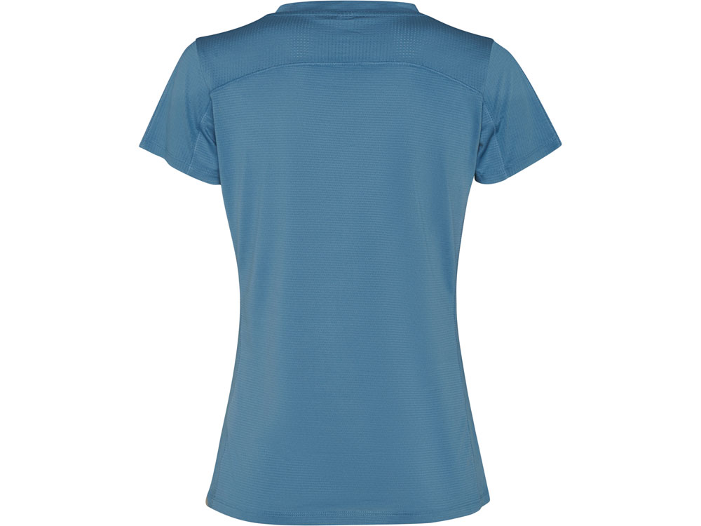 Женская технологическая футболка с короткими рукавами. Легкая ткань из переработанного полиэстера. · Воротник с перекрещенными деталями. · Кокетка сзади и рукава из дышащей ткани. · Направленные вперед и наклонные швы по бокам и плечам. · Закругленный низ. · Комбинация дышащих и эластичных тканей.