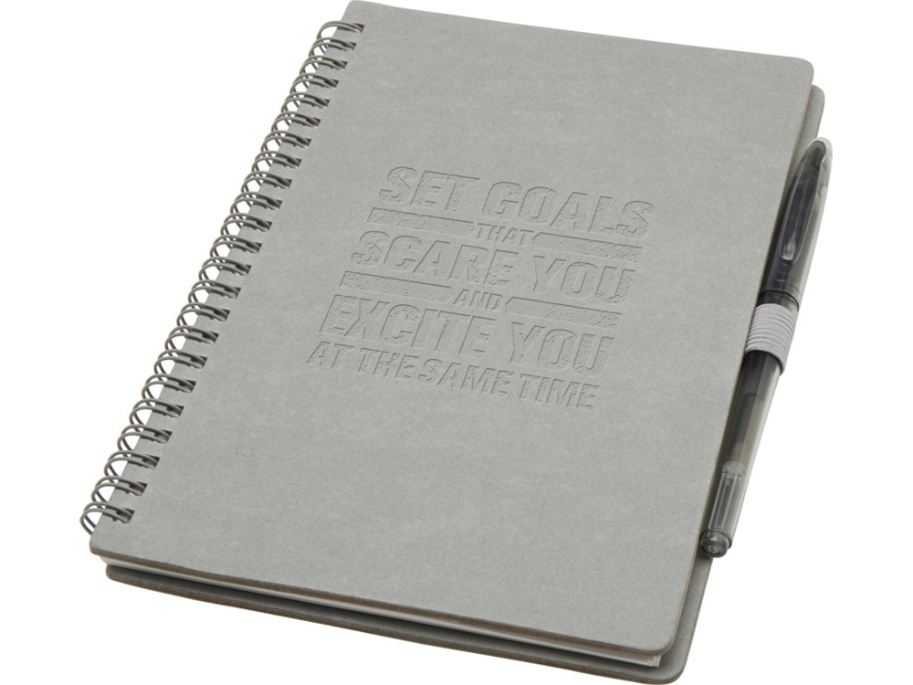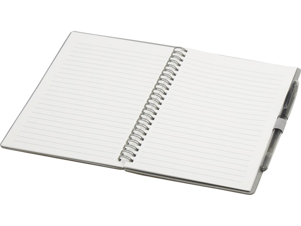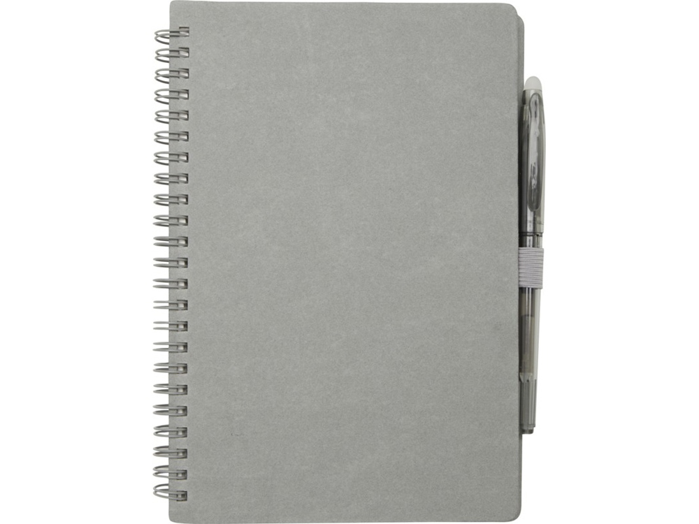 Многоразовый набор из ручки и блокнота в мягкой обложке из каменной бумаги. Блокнот имеет обложку из картона, закругленные углы и 32 листа линованной бумаги плотностью 120 г/м². В производстве каменной бумаги не используется дерево, а на сам процесс изготовления затрачивается гораздо меньше энергии в сравнении с производством переработанной или целлюлозной бумаги. Сзади имеется карман для хранения черной протирочной ткани (входит в комплект). Ручка из переработанного пластика с стираемыми чернилами, прозрачным корпусом, белым ластиком сверху и однотонной цветной рукояткой. Цвет чернил: черный. Длина непрерывной линии: 250 метров. Размер пера: 0,7 мм.
