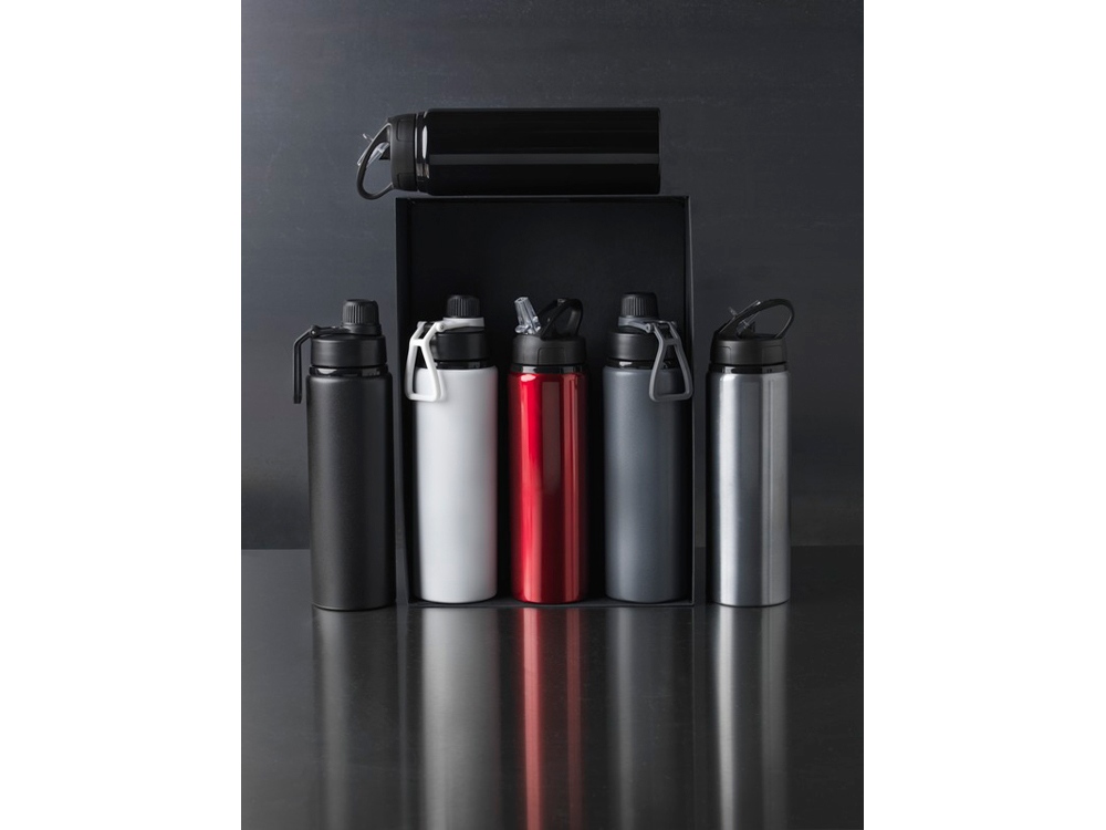 Алюминиевая бутылка с одинарными стенками и съемной крышкой с откидным носиком для питья. На крышке есть ручка для удобной переноски. Без содержания БФА. Объем 800 мл.
