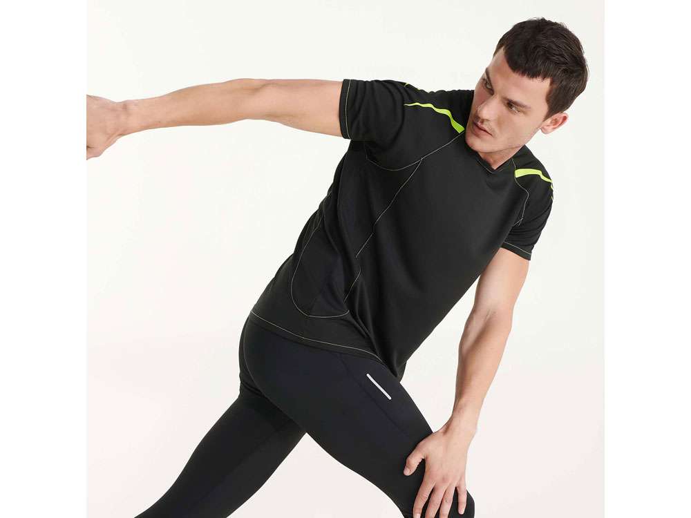 Футболка с коротким рукавом реглан из технологического джерси. Контрастные отстрочки по манжетам, талии, горловине и боковым швам. Дышащее технологичное полотно - легко стирается и быстро сохнет. Светоотражающие детали, за исключением черного и королевского синего цветов, в которых эти детали желтые.