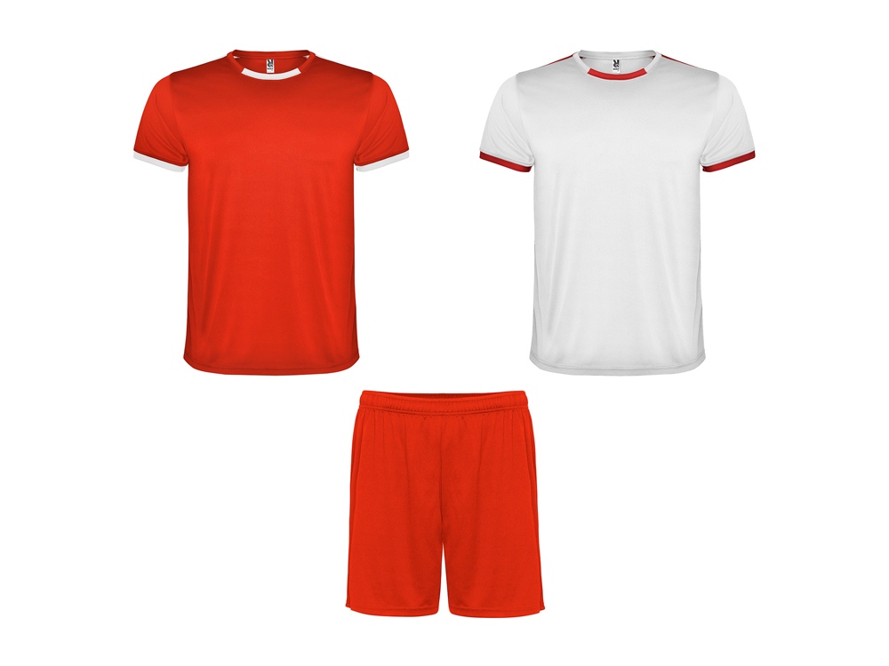 Спортивный костюм унисекс состоит из двух футболок и одних шорт. - Короткие рукава с контрастным широким рибом. - Цвет второй футболки — полностью противоположный первой. - Круглая горловина с двухцветной окантовкой и усиленными закрытыми внутренними швами. - Шорты с эластичным поясом с внутренним шнурком в тон и усиленной строчкой.