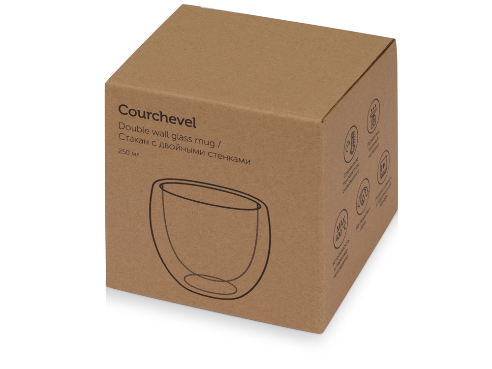 Стильный стакан с двойными стенками Courchevel подходит для горячих и охлажденных напитков. Он станет отличным бизнес-подарком. • Выполнен из термостойкого боросиликатного стекла, которое устойчиво к перепаду температур до 400℃. • Обладает минимальным весом. • Не обжигает руки. • Подходит для хранения в морозильной камере. Внимание, стеклянная посуда с двойными стенками не предназначена для мытья в посудомоечной машине и использования в микроволновой печи. Рекомендуется бережная ручная мойка без использования жестких щеток и абразивных чистящих средств.