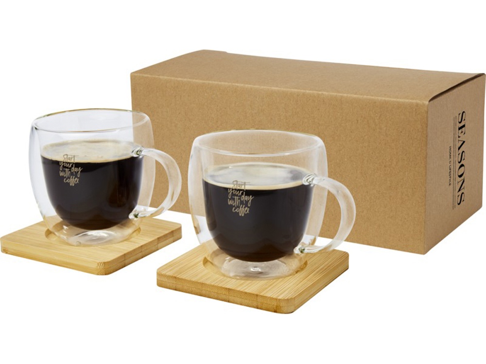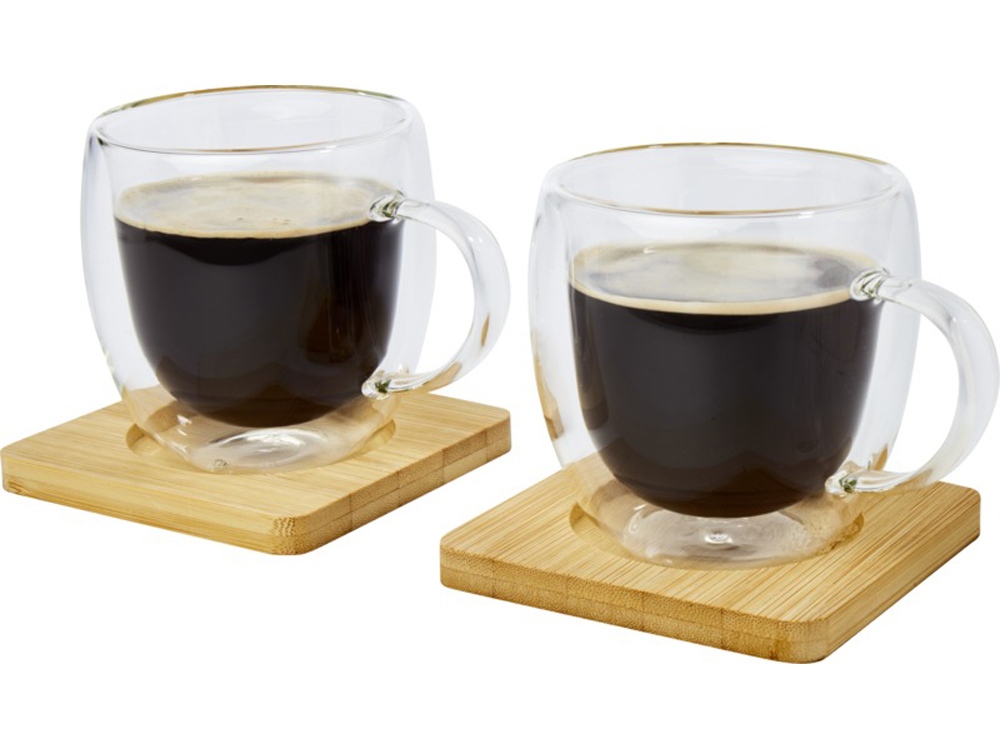 Набор из 2 термостойких стаканов с двойными стенками и бамбуковыми подставками. Бамбук взят из устойчивых, экологически и социально ответственных источников. Благодаря боросиликатному стеклу и двойным стенкам температура напитка не меняется в течение длительного времени. Объем 250 мл. Размер подставки: 10 x 10 x 1 см.