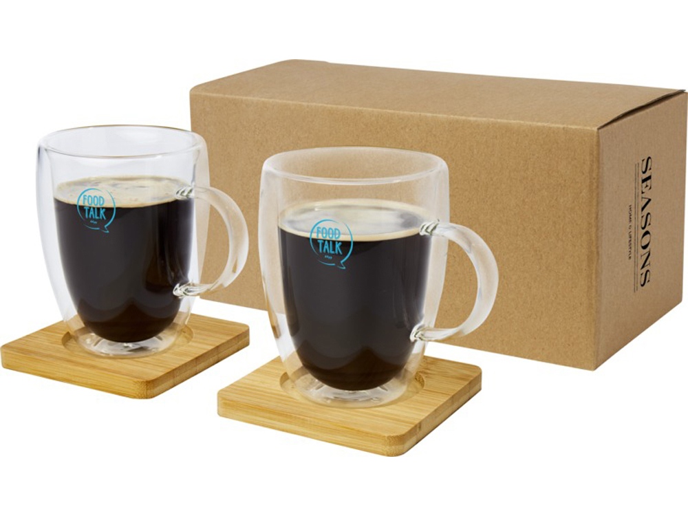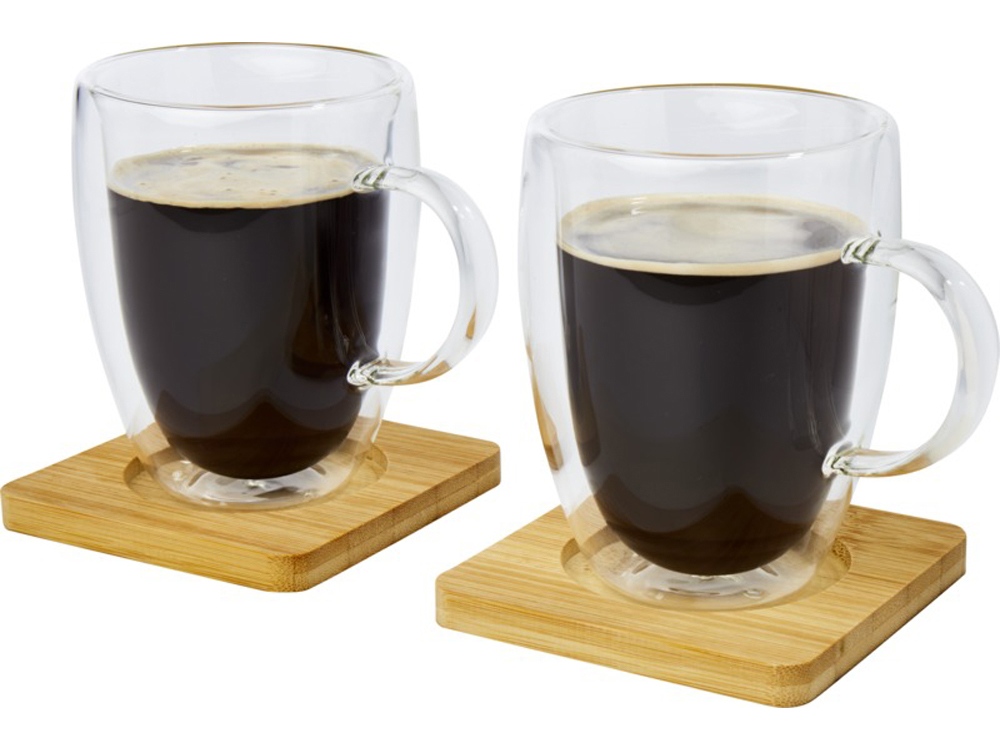 Набор из 2 термостойких стаканов с двойными стенками и бамбуковыми подставками. Бамбук взят из устойчивых, экологически и социально ответственных источников. Благодаря боросиликатному стеклу и двойным стенкам температура напитка не меняется в течение длительного времени. Объем 350 мл. Размер подставки: 10 x 10 x 1 см.