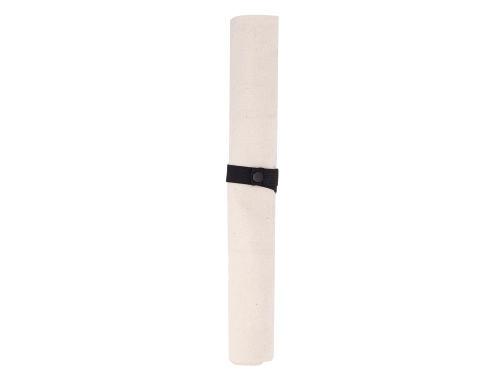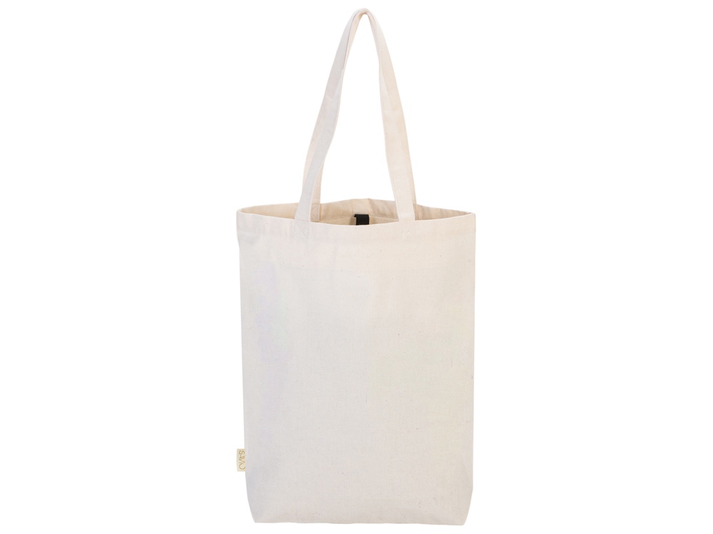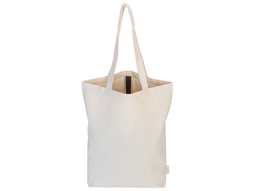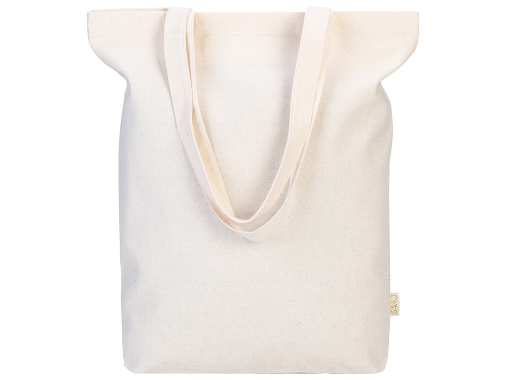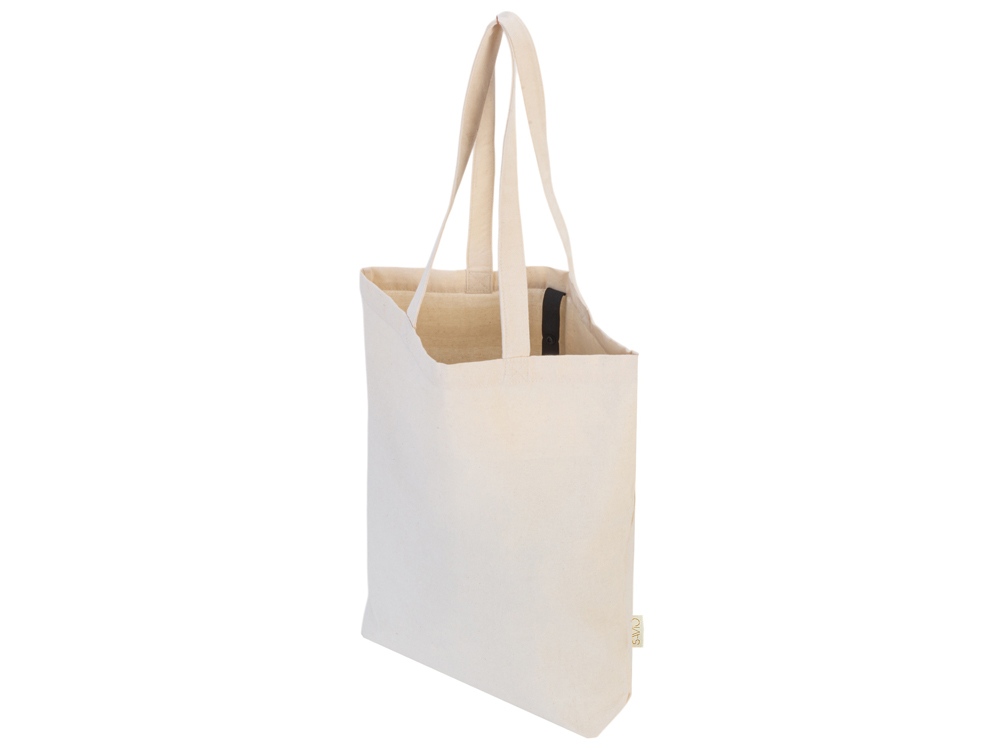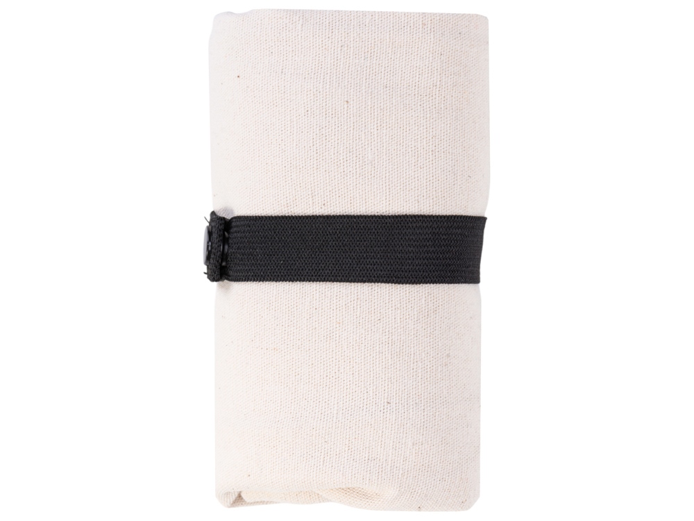 Удобная сумка-шоппер из переработанного хлопка. Можно хранить в сложенном виде и фиксировать с помощью эластичной ленты, застегивающейся на кнопку.