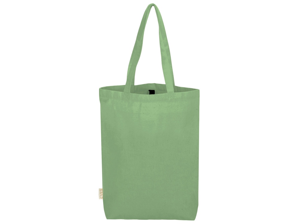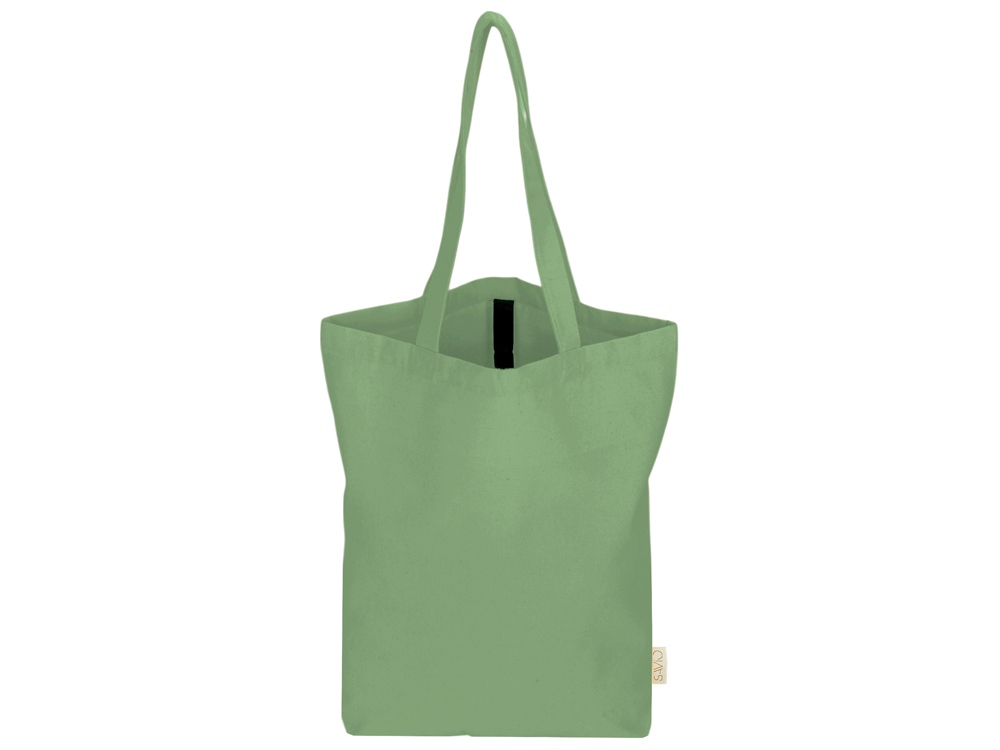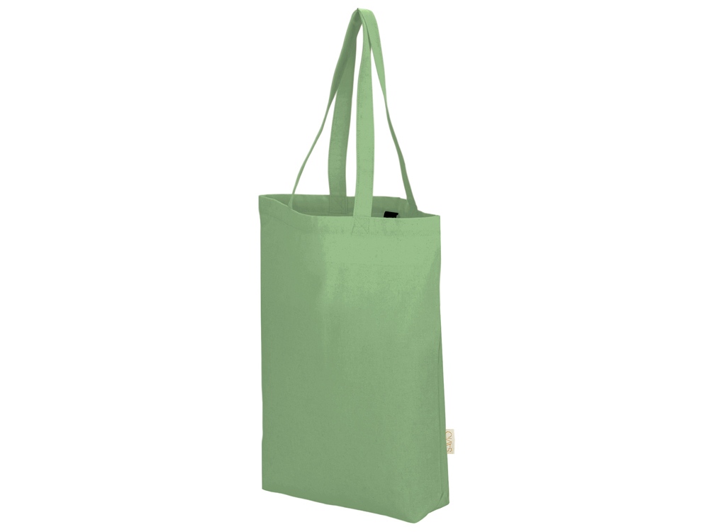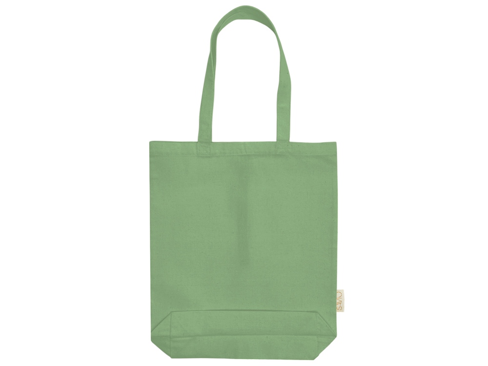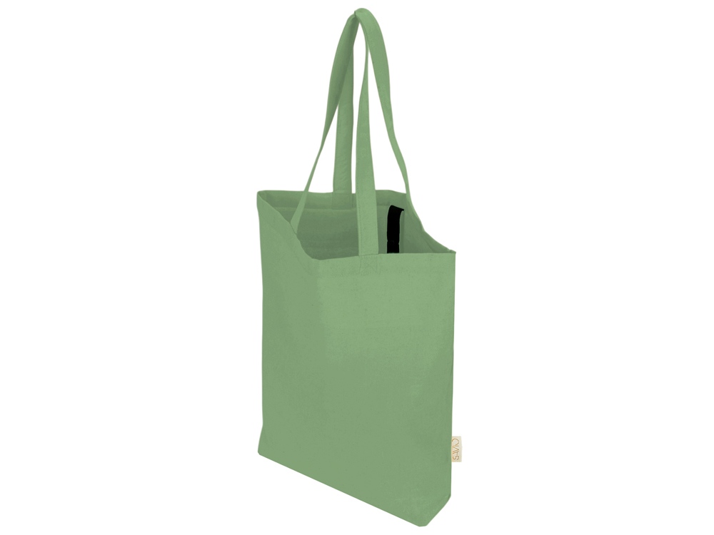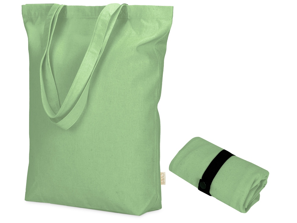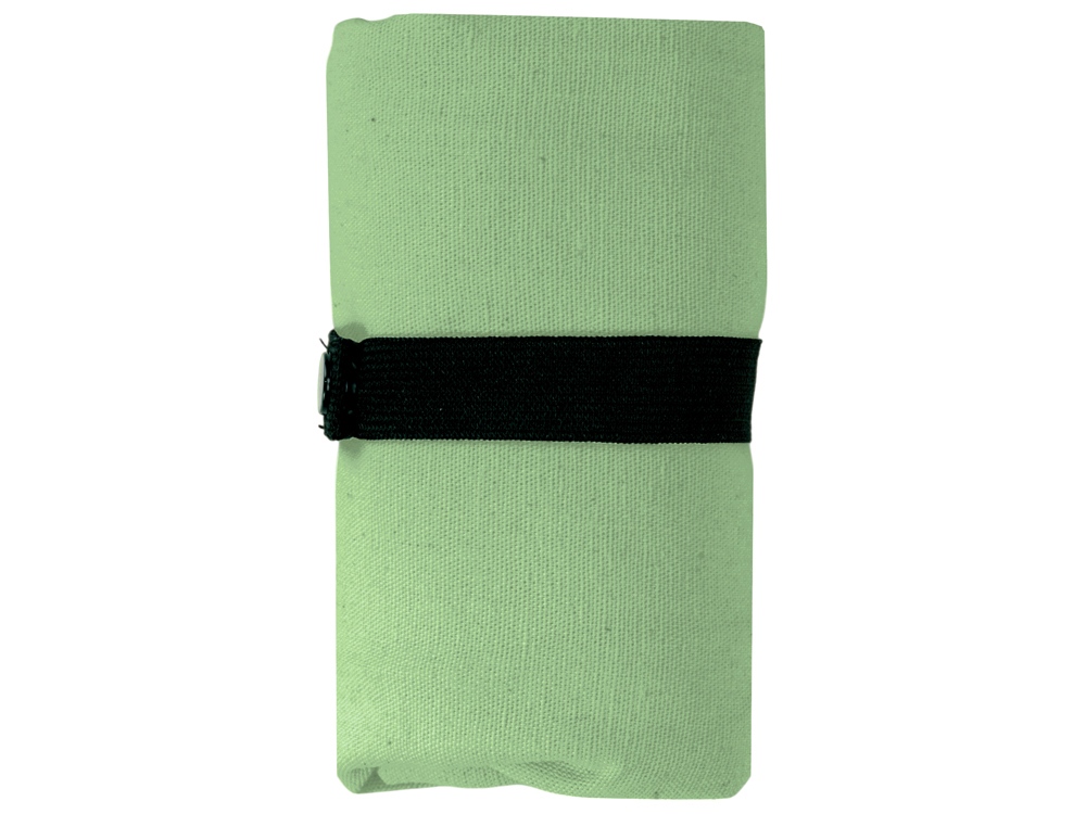 Удобная сумка-шоппер из переработанного хлопка. Можно хранить в сложенном виде и фиксировать с помощью эластичной ленты, застегивающейся на кнопку.