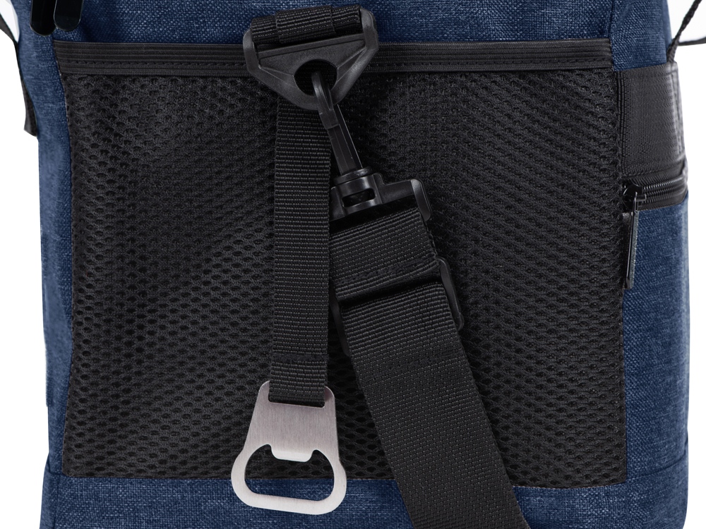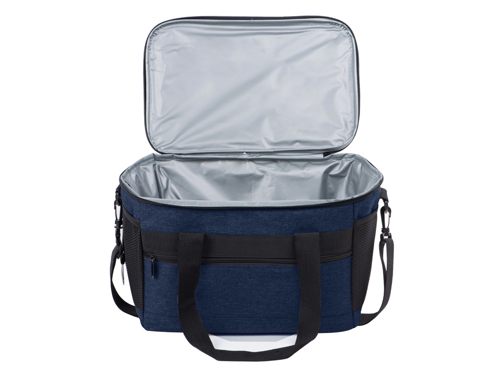 Вместительная сумка-холодильник со специальной конструкцией дна, предотвращающей протекание наружу жидкости от размораживания. Поверхность сумки всегда остается сухой. Основное отделение и карман спереди на молнии. Сбоку 2 сетчатых кармана. Съемный плечевой ремень регулируется по длине. Короткие ручки фиксируются вместе застежкой-липучкой. В комплекте открывалка для бутылок.