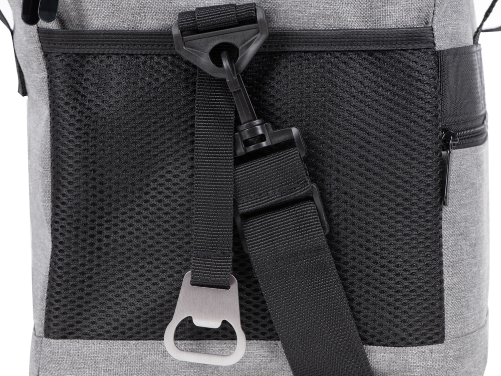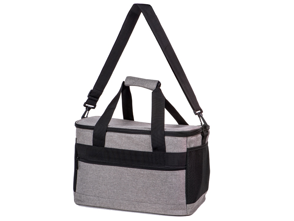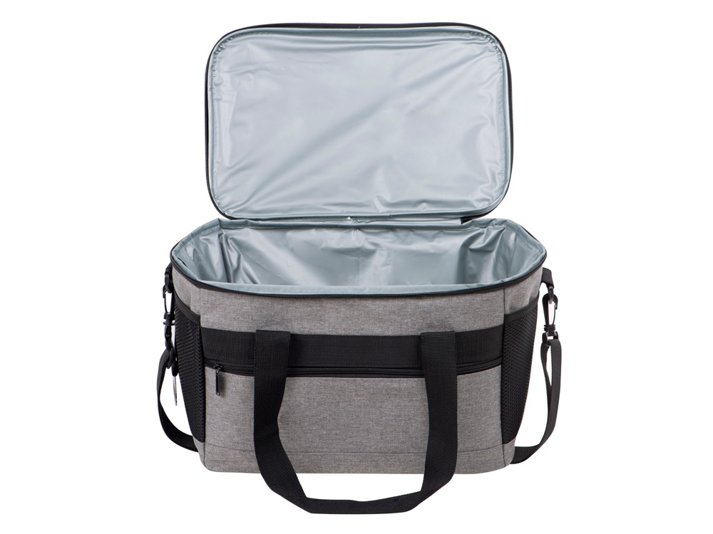 Вместительная сумка-холодильник со специальной конструкцией дна, предотвращающей протекание наружу жидкости от размораживания. Поверхность сумки всегда остается сухой. Основное отделение и карман спереди на молнии. Сбоку 2 сетчатых кармана. Съемный плечевой ремень регулируется по длине. Короткие ручки фиксируются вместе застежкой-липучкой. В комплекте открывалка для бутылок.