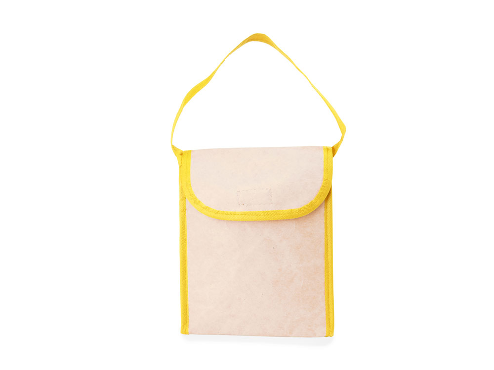 Сумка-холодильник из ламинированной бумаги с изотермической алюминиевой подкладкой и изоляционной пеной толщиной 2 мм. Ручка 60 см и клапан с застежкой-липучкой. Окантовка на сумке и ручке в тон