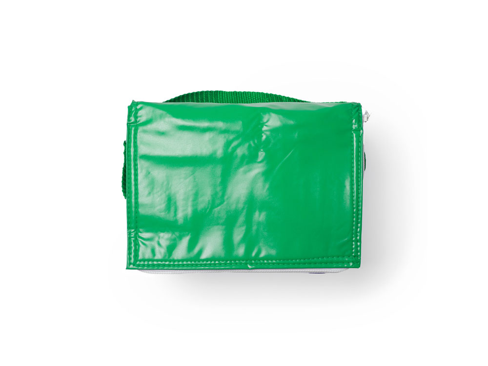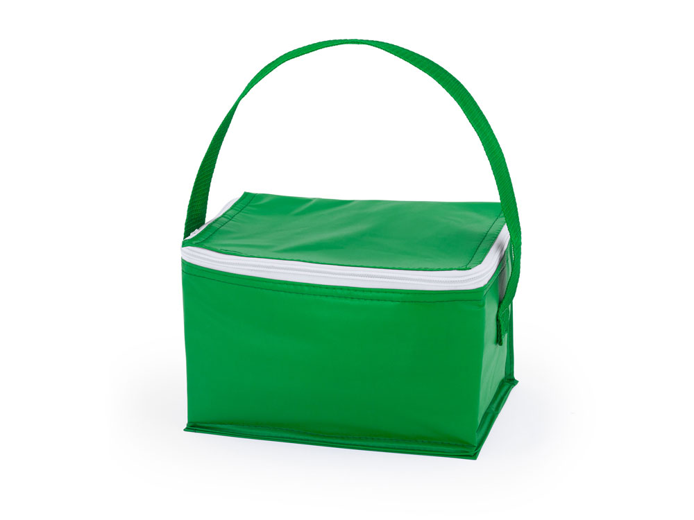 Сумка-холодильник с подкладкой из изотермического алюминия на 6 банок из ПВХ. Ручка для переноски и застежка-молния.