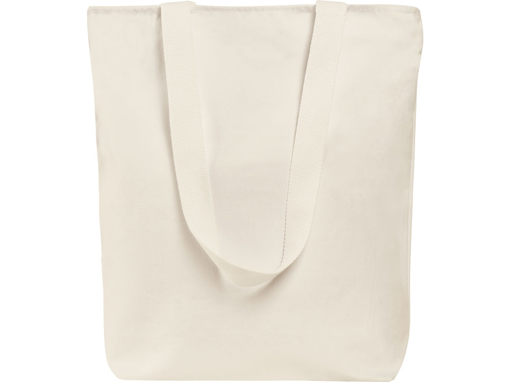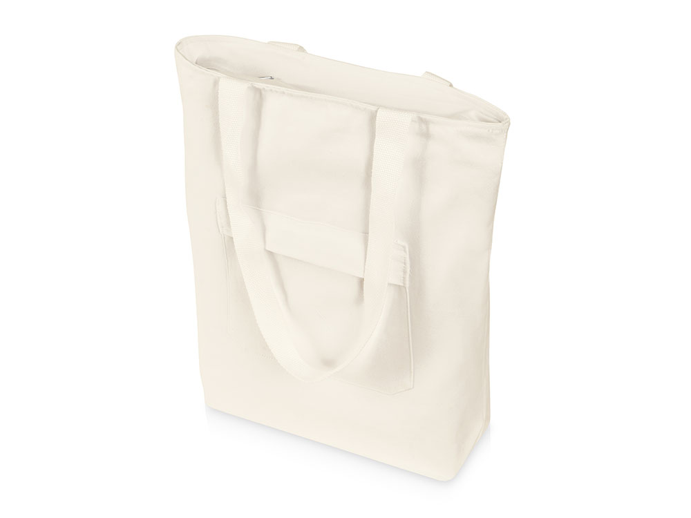 Преимущество этой сумки в наличии застежки молнии на основном отделении - ее содержимое остается закрытым. Донная складка увеличивает вместимость. Снаружи расположен карман на молнии. Парусиновые ручки в тон сумки.
