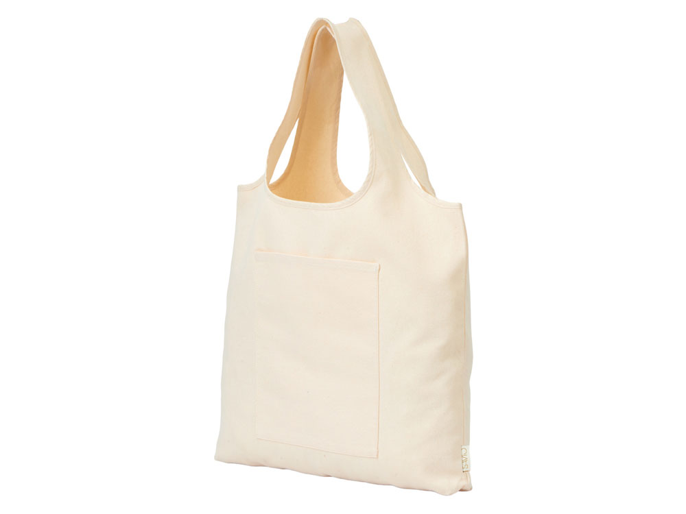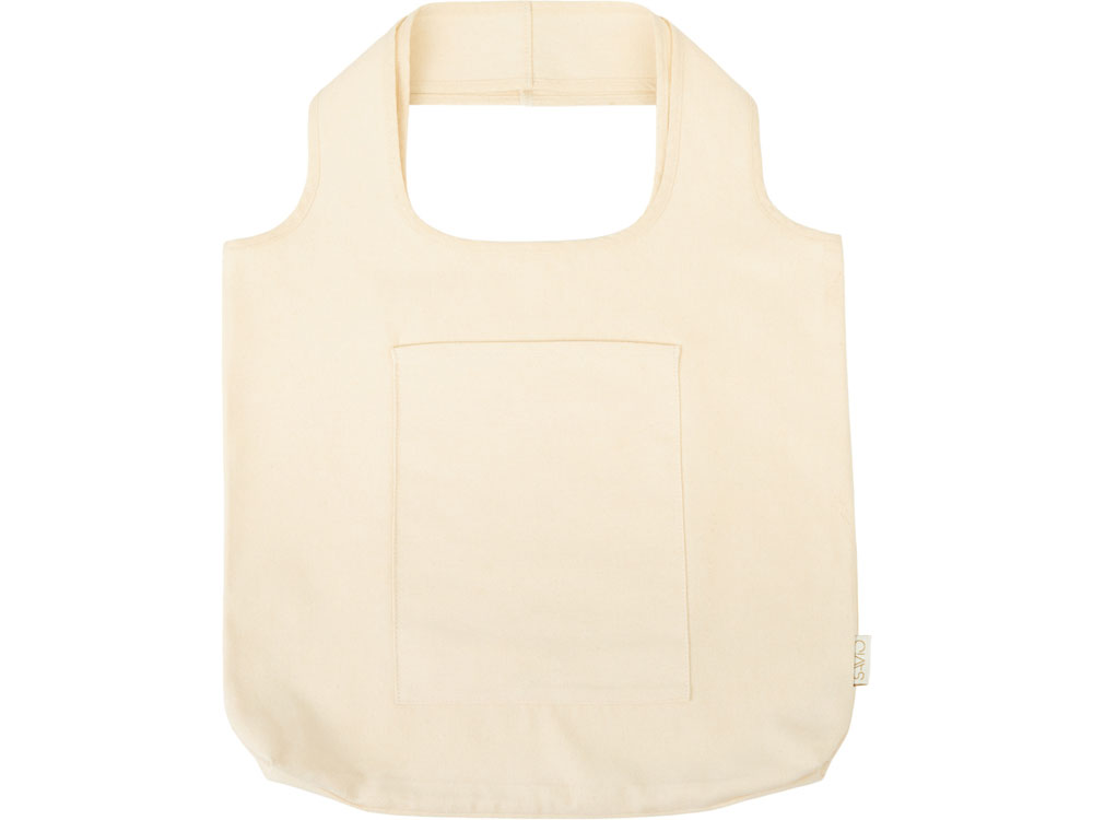 Вместительная сумка-шоппер из очень плотного переработанного хлопка с широкими лямками и большим наружным карманом 20 x 25 см спереди.