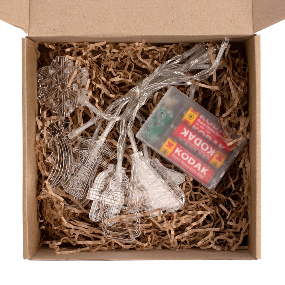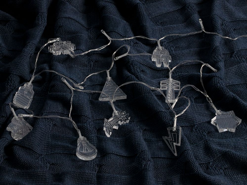 Гирлянда состоит из 20 светодиодов с холодным светом и 10 акриловых фигурок.