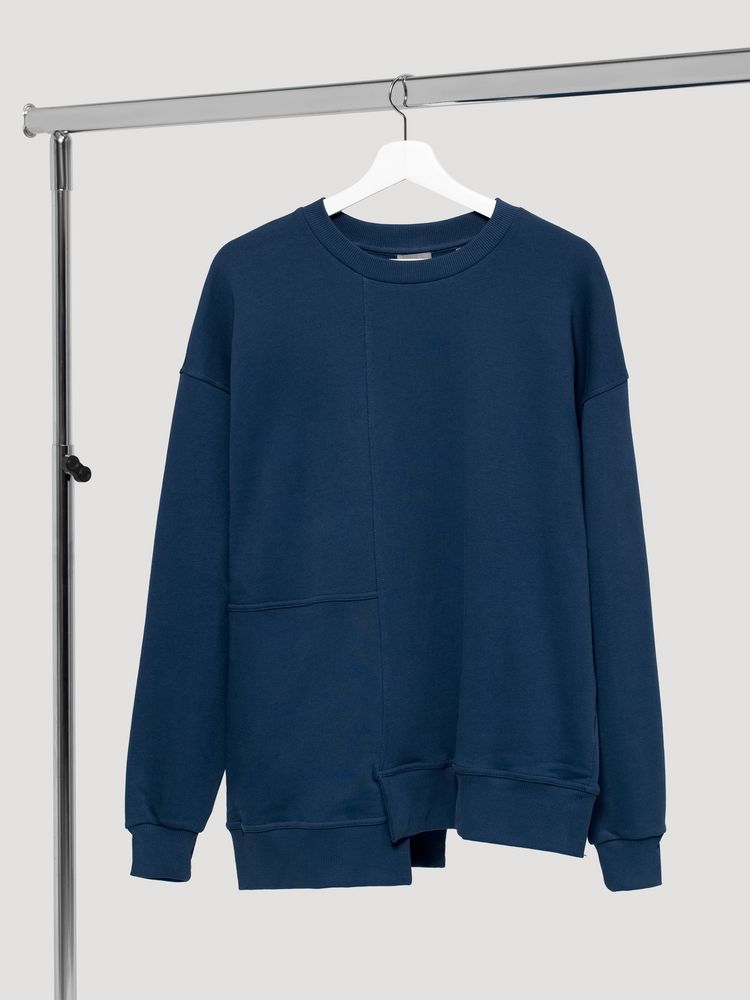 Свитшот унисекс свободного кроя со спущенным плечом и нестандартным нижним краем.