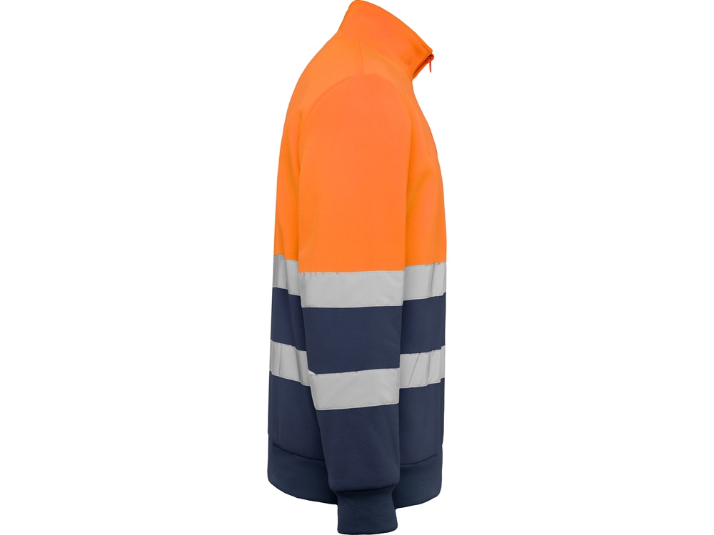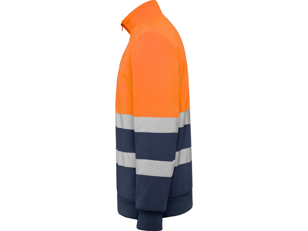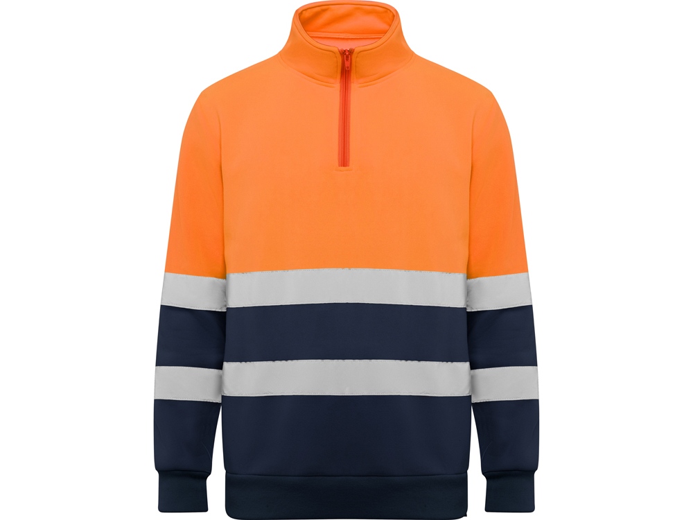 Свитшот с воротом на молнии, предназначен для использования в условиях плохой видимости. Внутри воротника отстрочка для усиления. Горизонтальные полоски со светоотражением на груди и рукавах. Манжеты и низ из рибовой ткани 1х1.