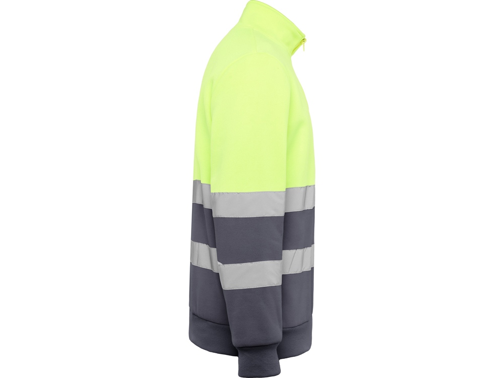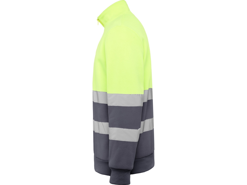 Свитшот с воротом на молнии, предназначен для использования в условиях плохой видимости. Внутри воротника отстрочка для усиления. Горизонтальные полоски со светоотражением на груди и рукавах. Манжеты и низ из рибовой ткани 1х1.
