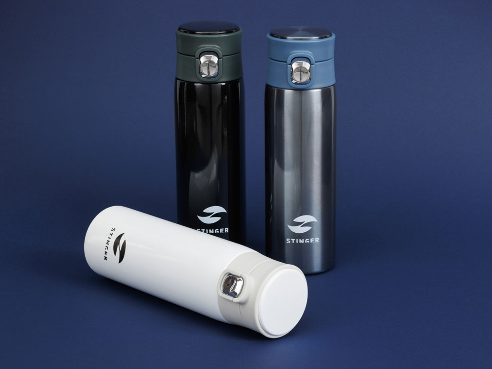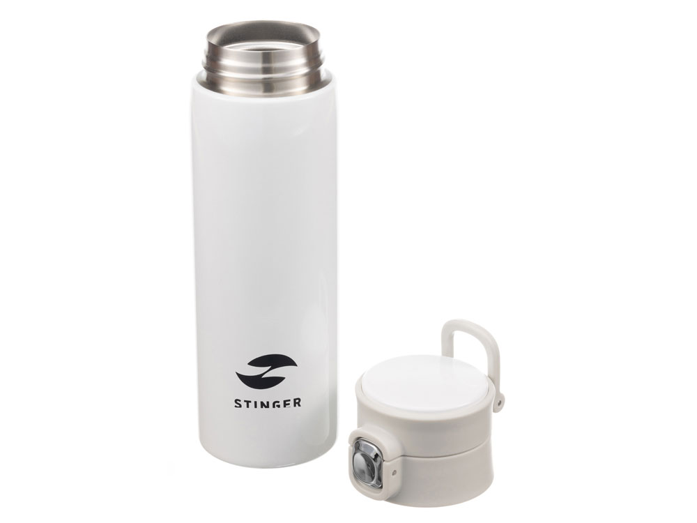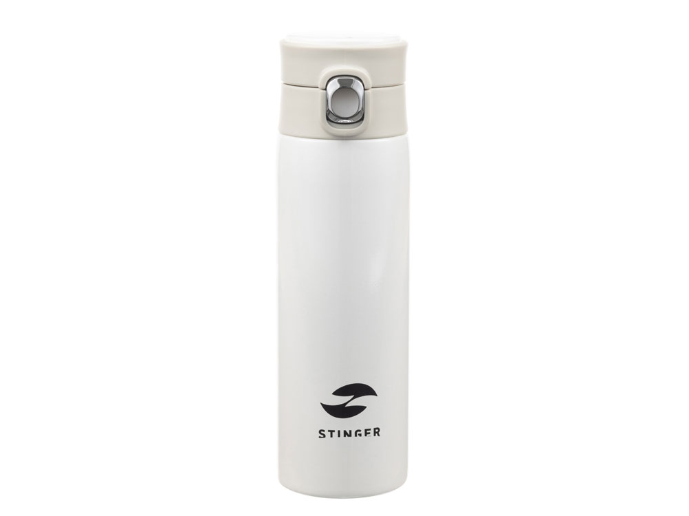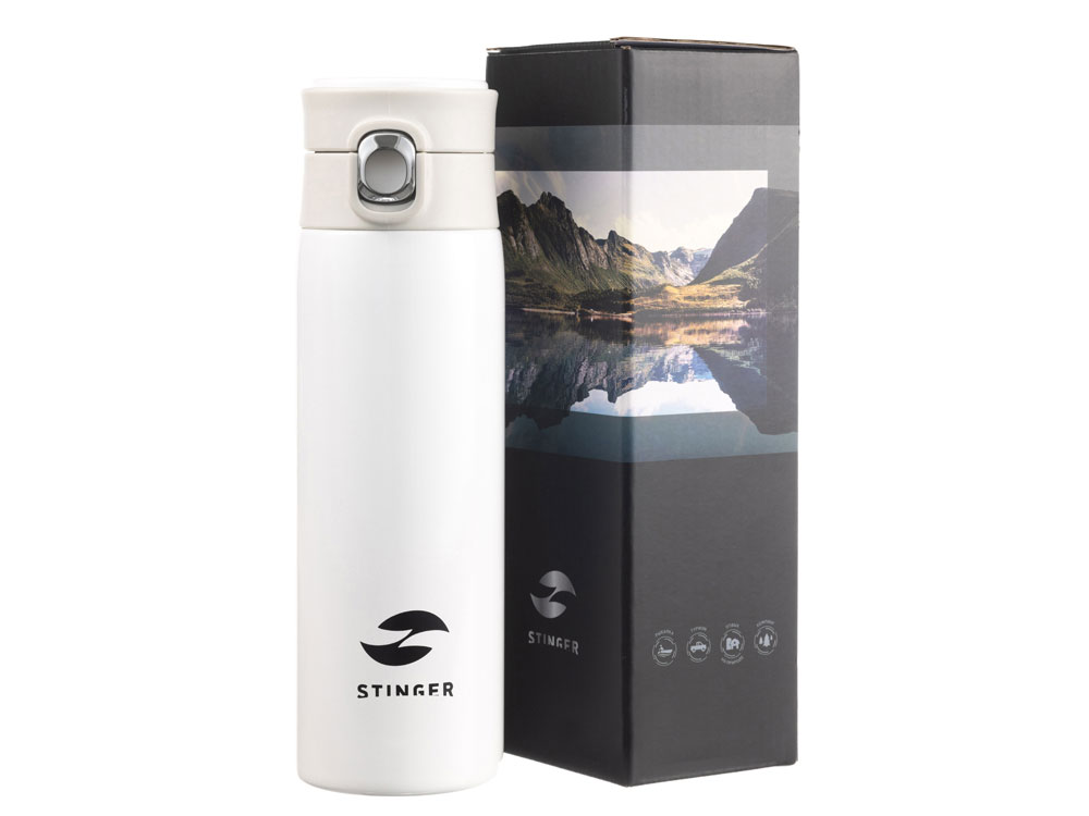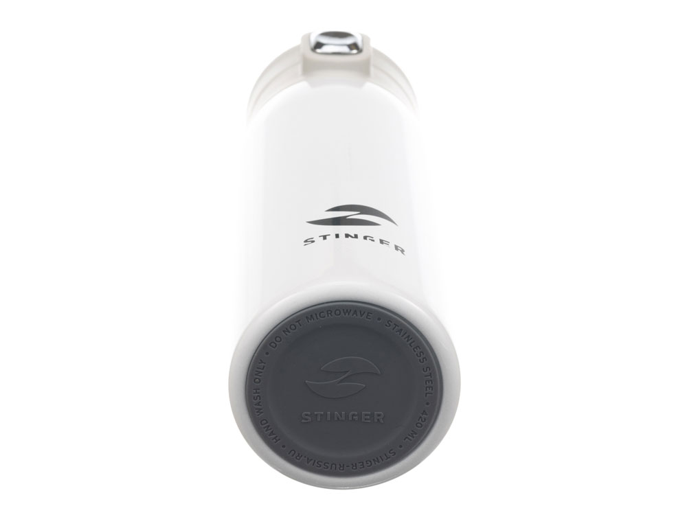 СВЕРХЛЕГКАЯ ТЕРМОКРУЖКА STINGER 0,42 л НАЗНАЧЕНИЕ Термокружка STINGER предназначена для употребления пищевых жидкостей (воды, напитков) как в горячем, так и в холодном состоянии. ХАРАКТЕРИСТИКИ Объём: 0,42 л Вес: 0,231 кг Время сохранения тепла: 6 часов Время сохранения холода: 6 часов Метод изоляции: вакуум Размеры • Высота – 21,9 см • Диаметр горлышка – 4,7 см • Диаметр дна – 6,5 см • Ширина (с учетом кольца и фиксатора) – 7,5 см Тип крышки: винтовая крышка-пробка с откидным механизмом Цвет: белый Материалы • Корпус: медицинская нержавеющая сталь, класс AISI 316 Stainless Steel • Колба: медицинская нержавеющая сталь, класс AISI 316 Stainless Steel • Крышка: пищевой пластик, не содержит бисфенол А (BPA free) • Прокладки-уплотнители: пищевой силикон ОСОБЕННОСТИ • Двойные стенки с вакуумной изоляцией отлично сохраняют температуру долгое время, гарантируют безопасность прикосновения к очень горячим и холодным напиткам. • Внешний и внутренний корпус из прочной медицинской нержавеющей стали AISI 316. • Пластиковые детали не содержат Бисфенол А (BPA FREE). • Герметичная крышка и дополнительный фиксатор защищают от случайного открывания и проливания жидкости. • Конструкция крышки позволяет открывать термокружку в одно касание и одной рукой – достаточно нажать на кнопку, верхняя крышка откинется на 180 градусов и автоматически зафиксируется в открытом положении. • Силиконовая накладка на дне предотвращает случайное скольжение и опрокидывание. • Ситечко для заварки чая или кофе. • Кольцо для удобства переноски. • Подходит под все виды подстаканников.