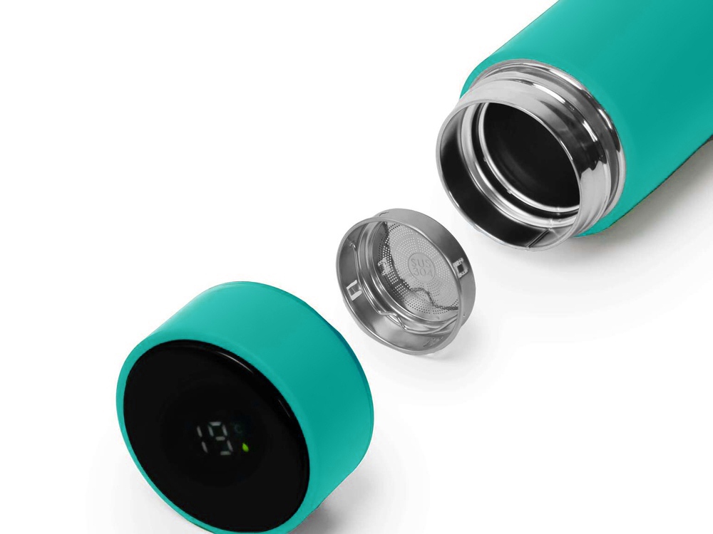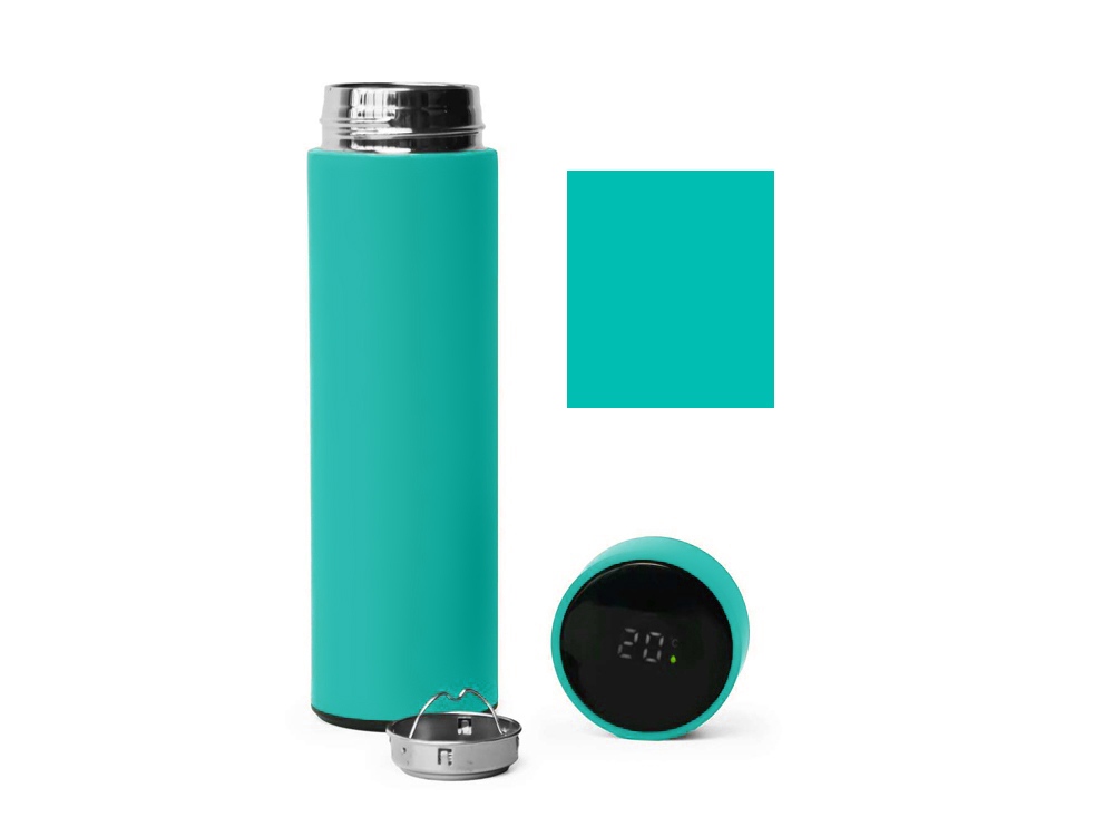 Термос из нержавеющей стали, покрытый цветным soft touch, с крышкой, в которой встроен термометр и LED дисплей, показывающий температуру внутри термоса. Объем: 500 мл. Упаковка: каждый термос в крафт коробке.