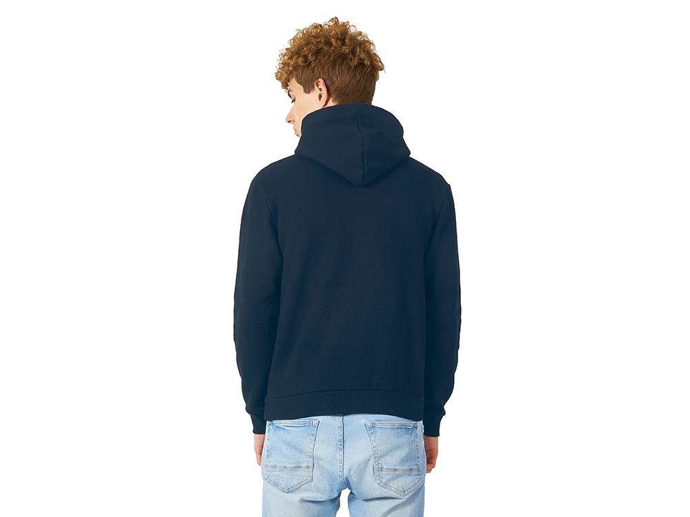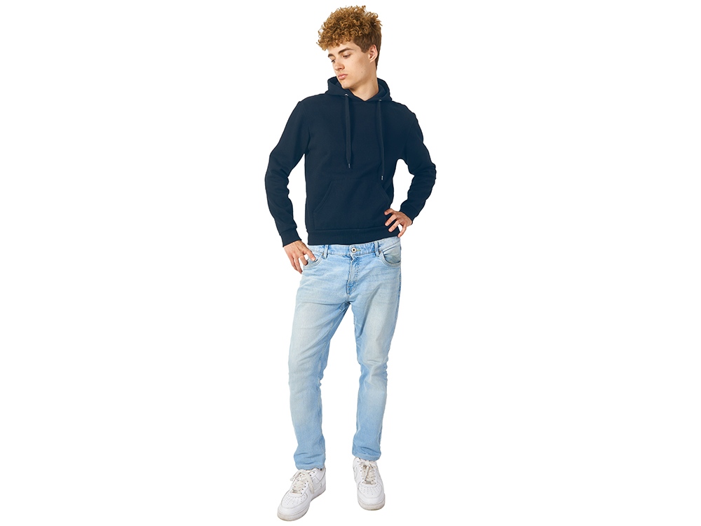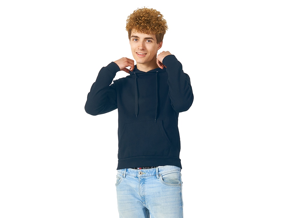 Толстовка с капюшоном (худи) из плотного футера с мягким начесом, с небольшим добавлением полиэстера. Удобная и практичная модель, подходит для прогулок по городу, активного отдыха, путешествий. • Прямой силуэт. • Капюшон с подкладкой в цвет основного материала, металлическими люверсами и плоским шнурком с наконечниками. • Удобный карман-кенгуру. • Долго сохраняет форму и не мнется благодаря небольшому содержанию полиэстера. • Гигроскопичное волокно, обладает хорошими гигиеническими свойствами. • Низ толстовки, рукавов и горловины обработаны рибом (резинкой) 1x1.