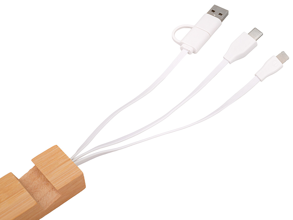 Универсальный кабель с подставкой 4-в-1 Unicable — стильное и практичное решение для современного пользователя. Этот компактный аксессуар станет незаменимым спутником в вашем кармане, сумке или на рабочем столе. Поставляется в фирменной коробке bamboo collection. Оснащён четырьмя разъёмами: • Входными разъемами USB-A и USB-C — для подключения к компьютеру, блоку питания или зарядному устройству. • USB-C — совместим с современными смартфонами, планшетами и ноутбуками. • Lightning — для некоторых устройств Apple (iPhone, iPad). Экологичный и стильный корпус из дерева Корпус кабеля выполнен из натурального бамбука — экологически чистого и прочного материала. Деревянная подставка не только защищает кабель от перегибов, но и служит удобной опорой для телефона при видеозвонках, прослушивании музыки или просмотре видео. Ключница с кольцом — всегда под рукой Специальное металлическое кольцо позволяет легко прикрепить Unicable к ключам, рюкзаку или сумке. Благодаря этому вы никогда не потеряете свой кабель — он будет всегда рядом, когда понадобится.